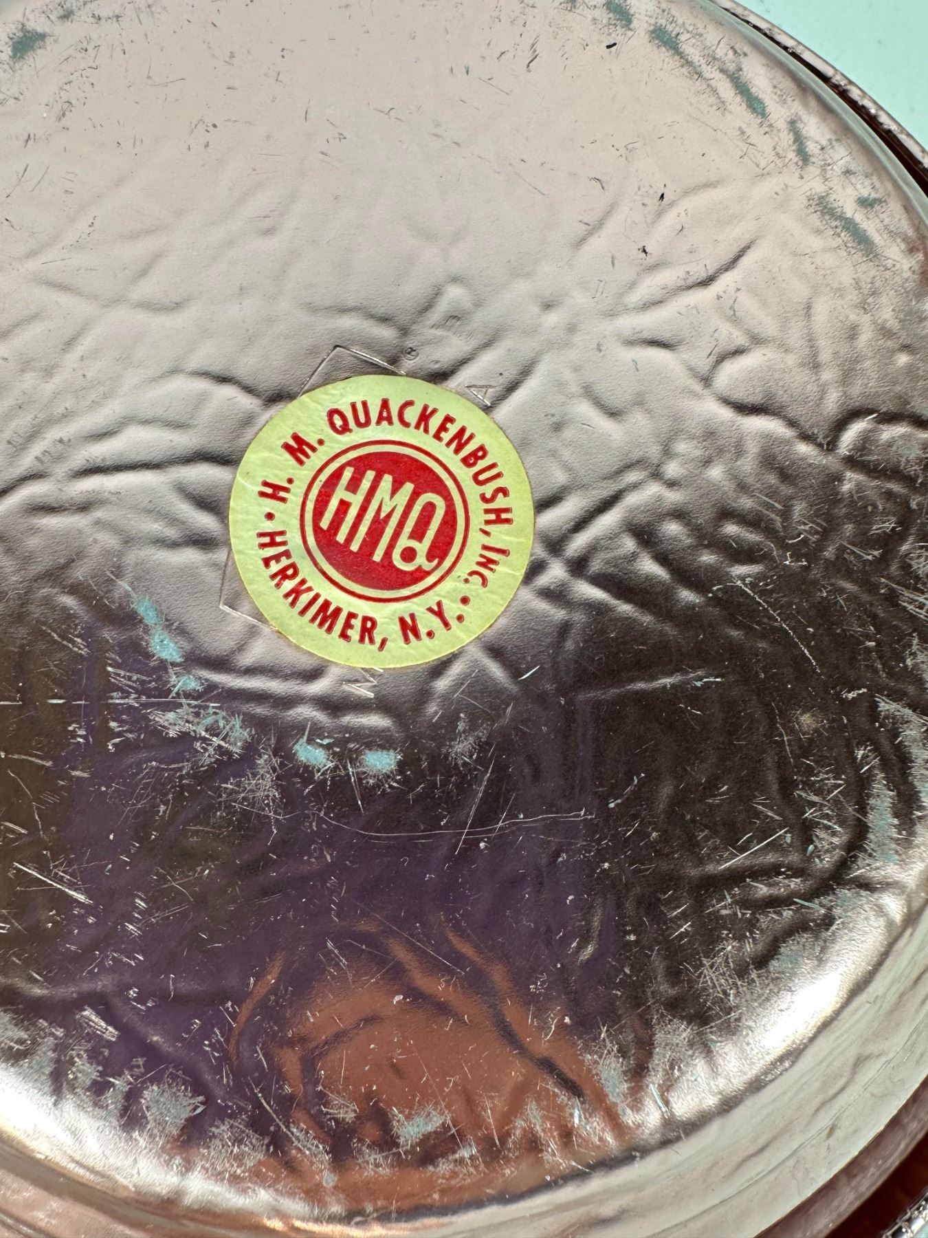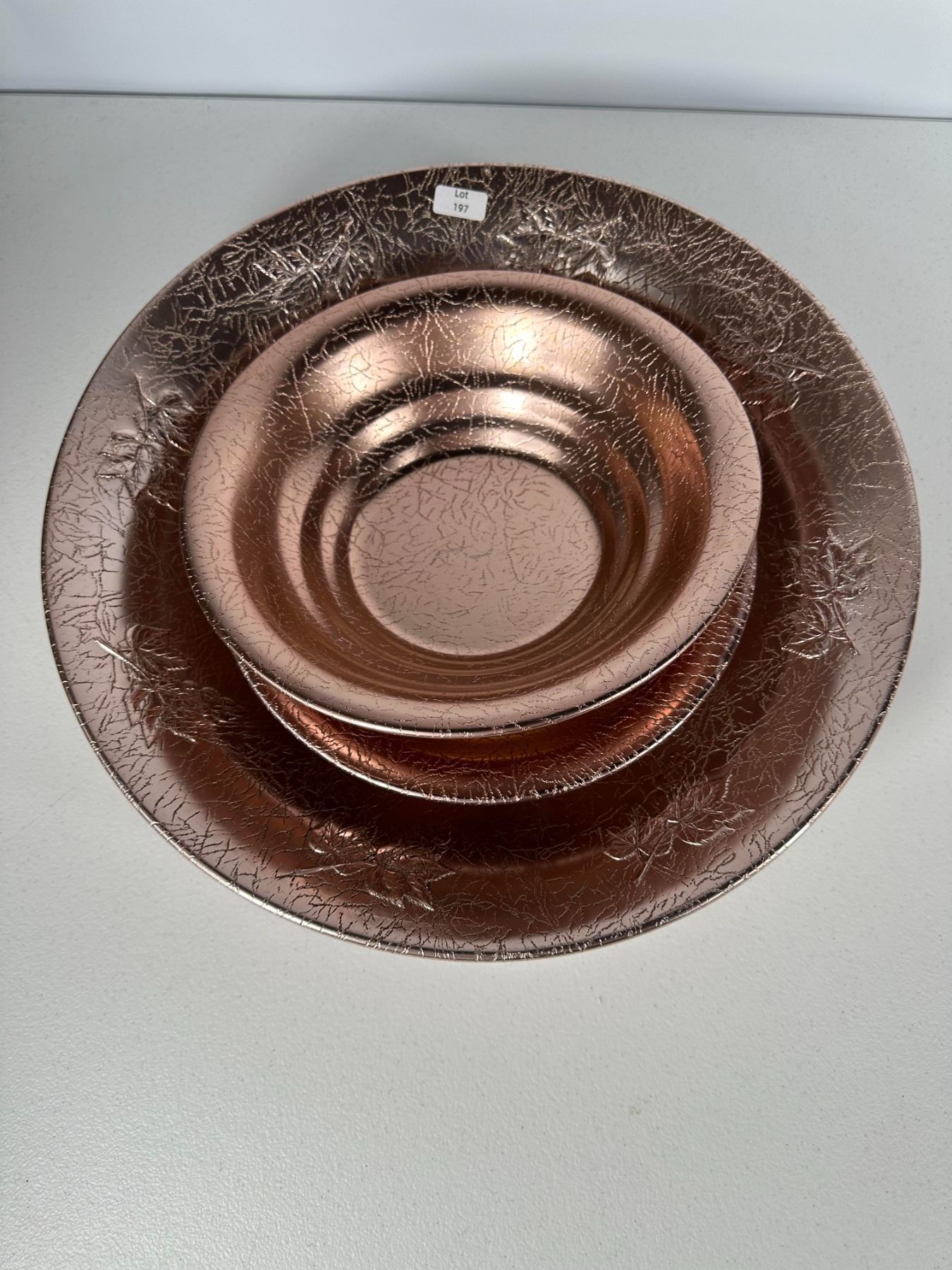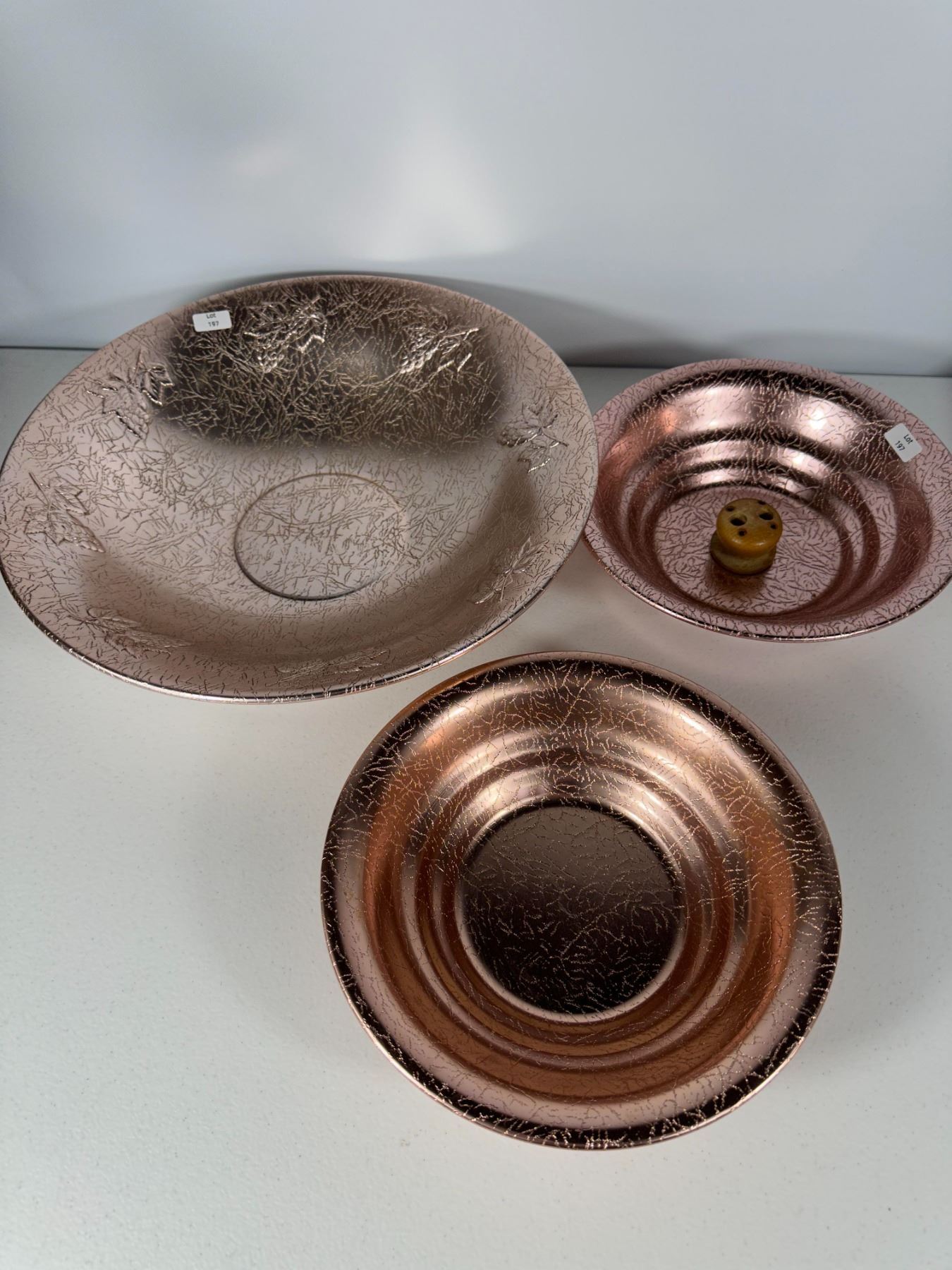 A vintage set of three nesting bowls by West Bend, Made in U.S.A.. Each has a striking copper-toned metallic finish with textured crackle surface. Diameters range from small to large, perfect for kitchen display or retro décor. Condition shows light age wear, consistent with use.