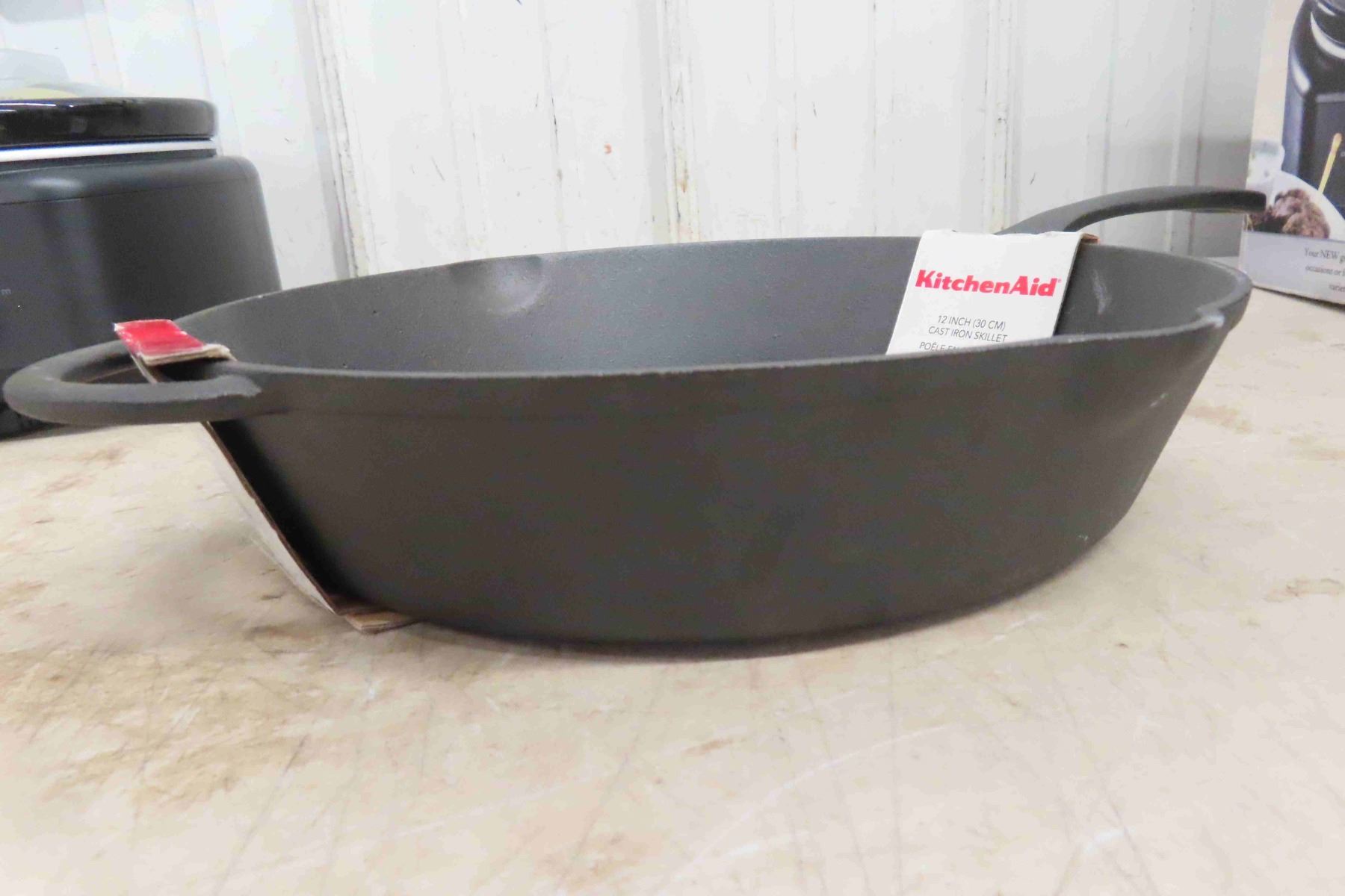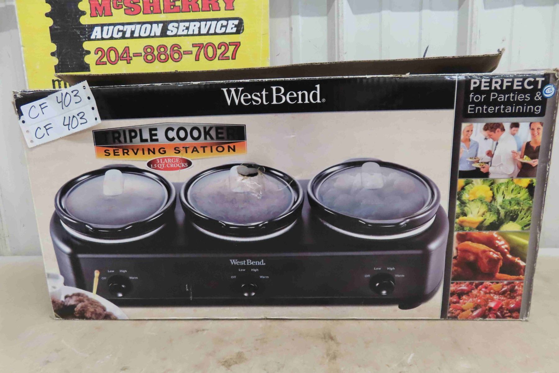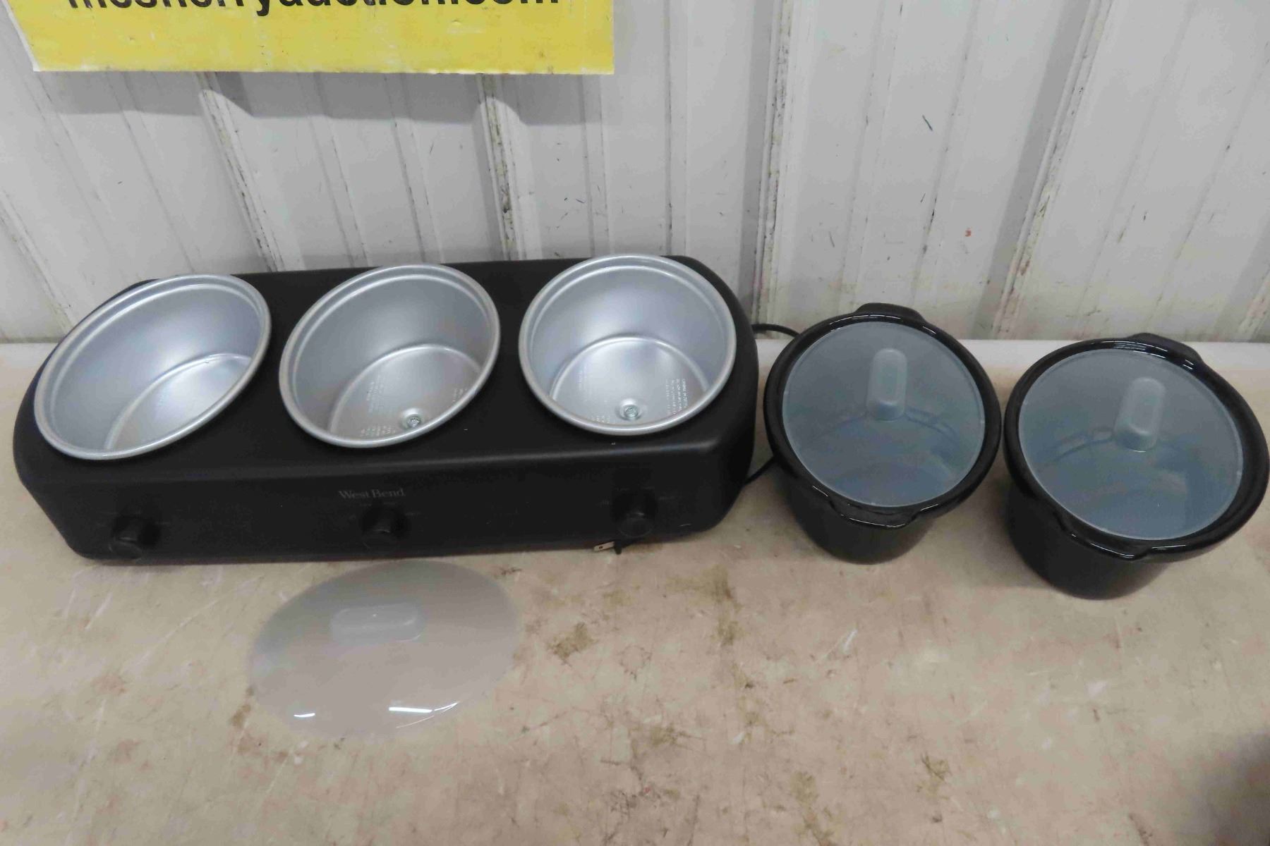 West Bend Triple Slow Cooker Serving Station with Kitchenaid Cast Iron Skillet 12", Missing 1 pot - New Store Return