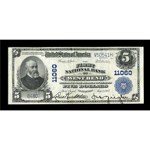 <B>West Bend, WI</B></I> - $5 1902 Plain Back Fr. 606 <B>The First NB</B></I> Ch. # 11060<BR>A pleasing <B>Very Fine-Extremely Fine</B></I> example from this Washington County issuer which should see some spirited competition.<BR><BR><b>Shipping:</b> Coins & Currency (<a target="_blank" href="http://www.heritageauctions.com/common/shipping.php">view shipping information</a>)