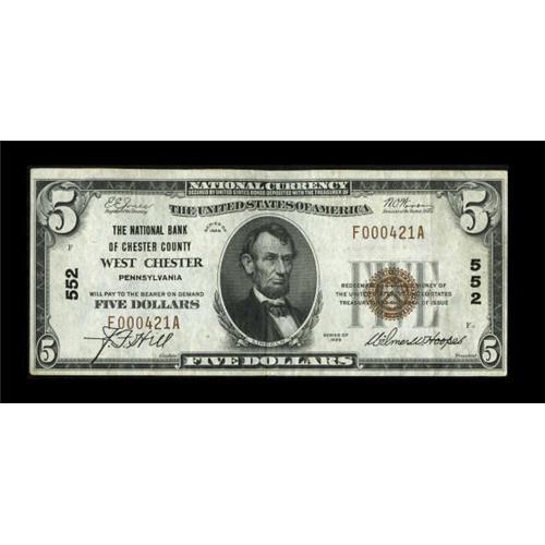 <B>West Chester, PA</B></I> - $5 1929 Ty. 1 <B>The NB of Chester County</B></I> Ch. # 552<BR> A mere three small notes are reported bearing this title, which was changed on February 1, 1930, after less than six months of use on Series 1929 notes. This piece is new to the census and considerably superior to the previously reported examples. Bright <B>Very Fine,</B></I> certain to be of interest to this community's many collectors. <BR><BR><b>Shipping:</b> Coins & Currency (<a target="_blank" href="http://www.heritageauctions.com/common/shipping.php">view shipping information</a>)