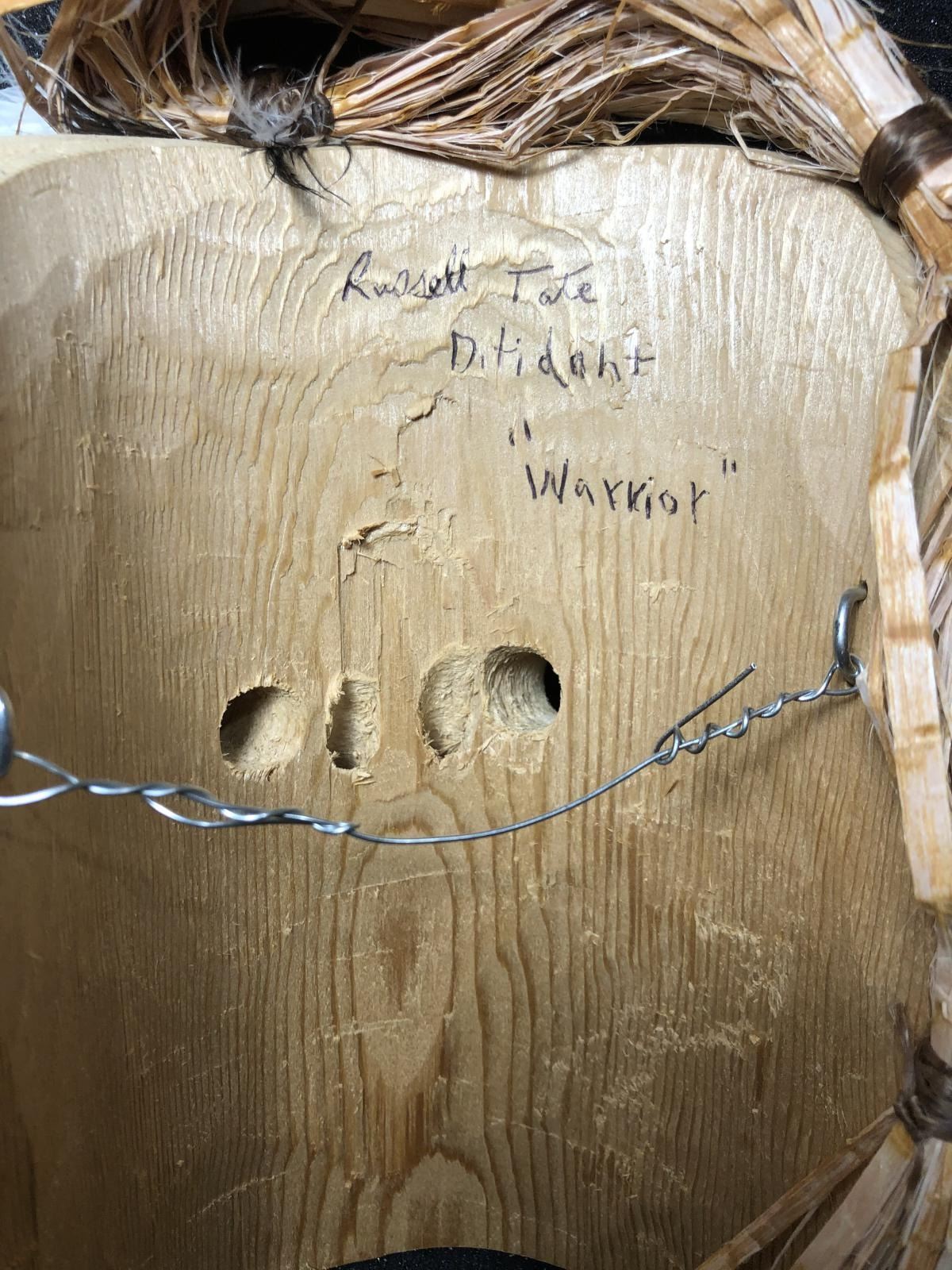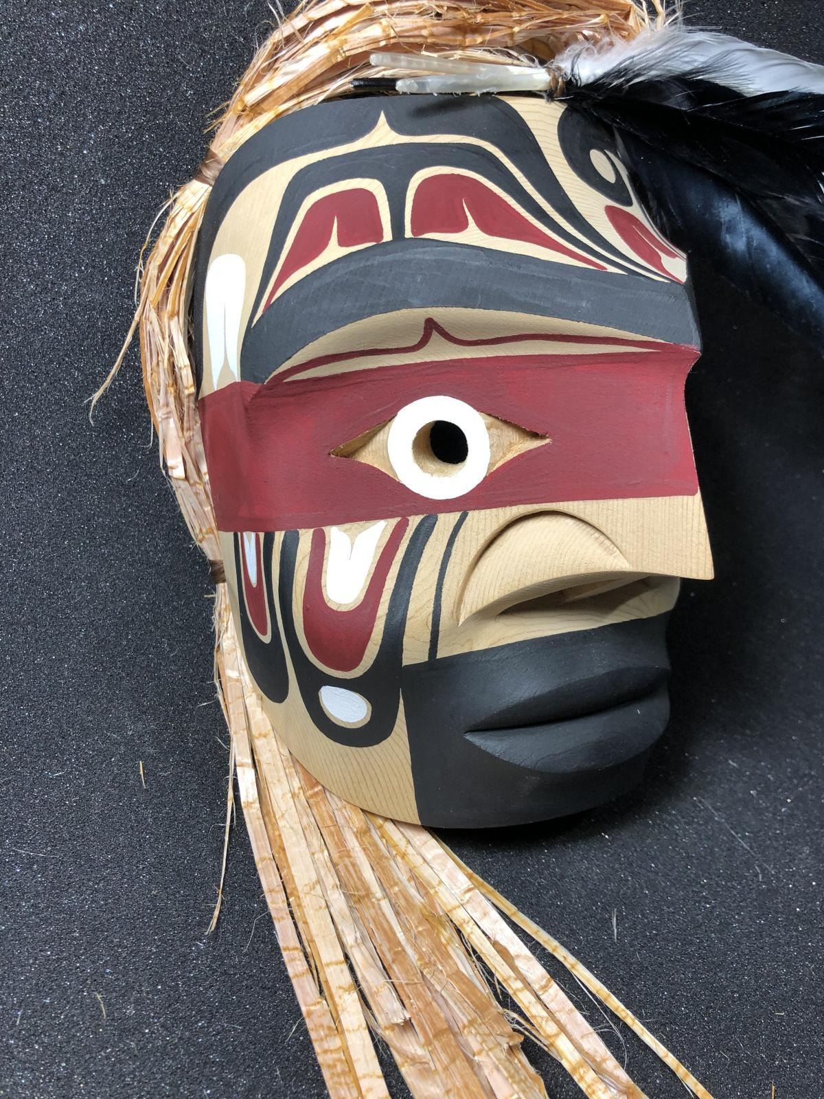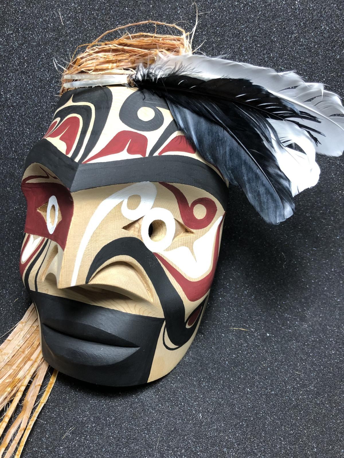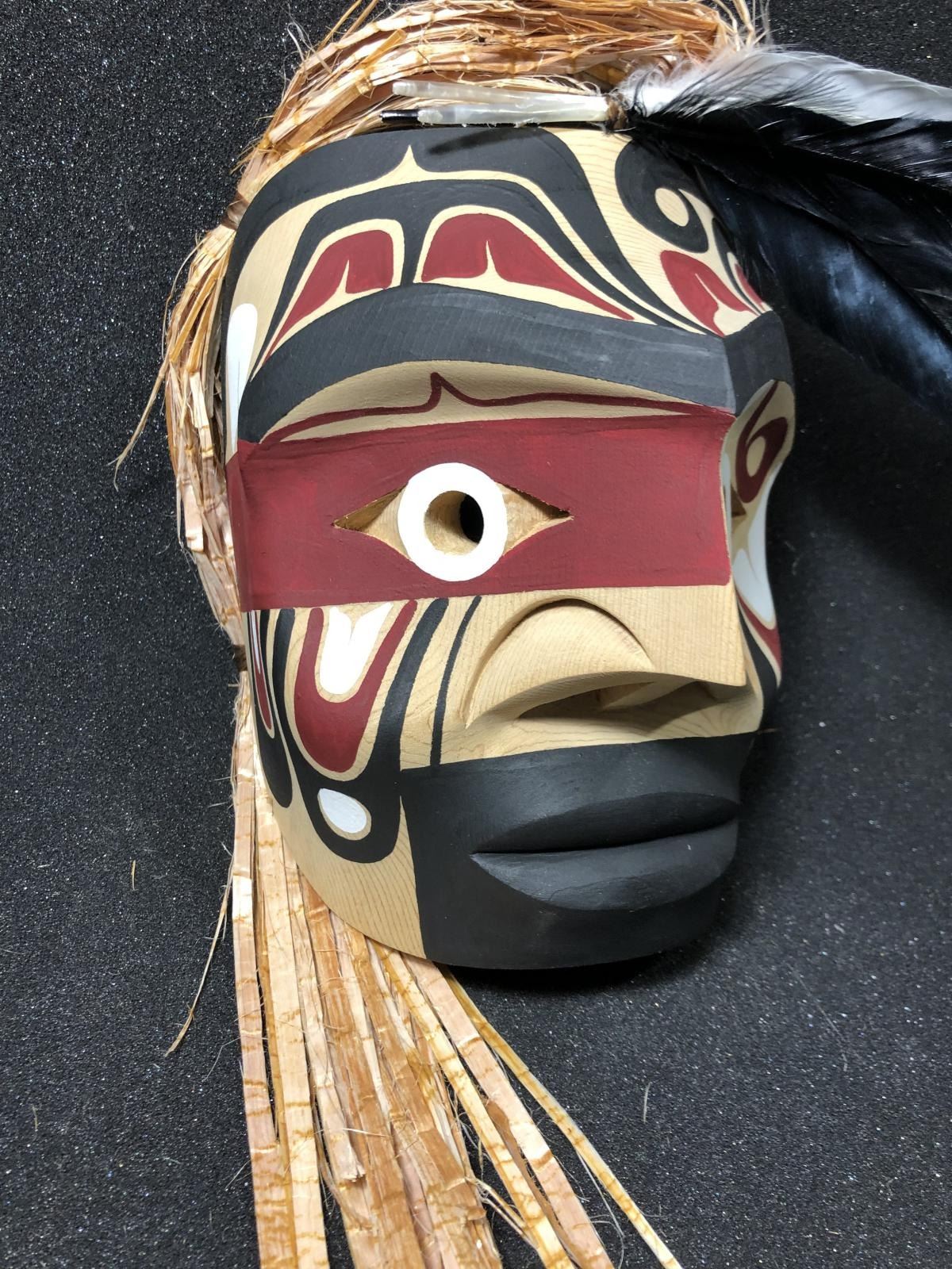West Coast Native Hand Carved Warrior Mask........8 inches plus the accessories height....cedar baek hairs .....Hand Craved on the Red cedar by First Nation Artist Russell Tate......Russell Tate from the Ditidaht First Nation on the southwest coast of Vancouver Island. He started carving in 2004, artists such as Art Thompson and the artists on the Ravens and Eagles show inspired him. Russell learned how to wood carved mostly working on his own. He specializes in masks and paddles, but is now working on small poles and miniatures for regalia. Russell has worked with Ben David and Cecil Dawson, and has collaborated on several pieces with Cecil
