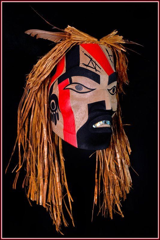 Keeper of Lost Souls..........native mask by master carver Doug David....14" height(without cedar bark) and has very strong presence.made of red cedar..abalone on the teeth unique painting...artist: Doug David. Doug David is the son of world reknowned master carver Joe David. msrp 3200