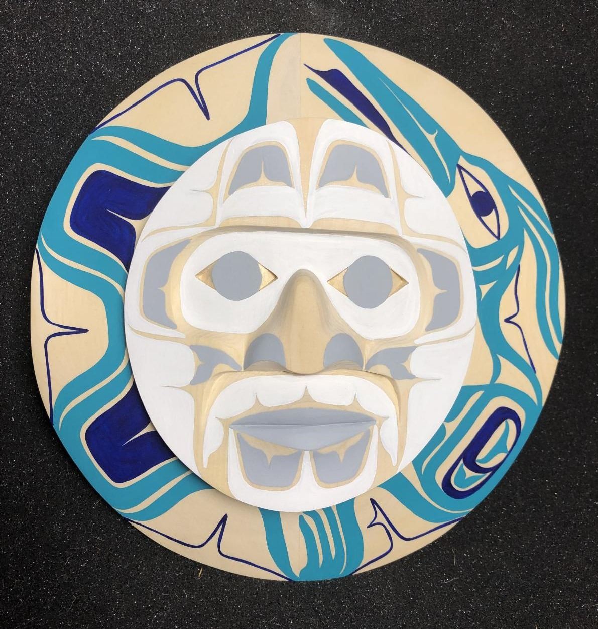 West Coast Native Moon Mask with Blue Heron Spirit........10 inches size.....Hand Craved on the yellow cedar by First Nation Artist Russell Tate......Russell Tate from the Ditidaht First Nation on the southwest coast of Vancouver Island. He started carving in 2004, artists such as Art Thompson and the artists on the Ravens and Eagles show inspired him. Russell learned how to wood carved mostly working on his own. He specializes in masks and paddles, but is now working on small poles and miniatures for regalia. Russell has worked with Ben David and Cecil Dawson, and has collaborated on several pieces with Cecil