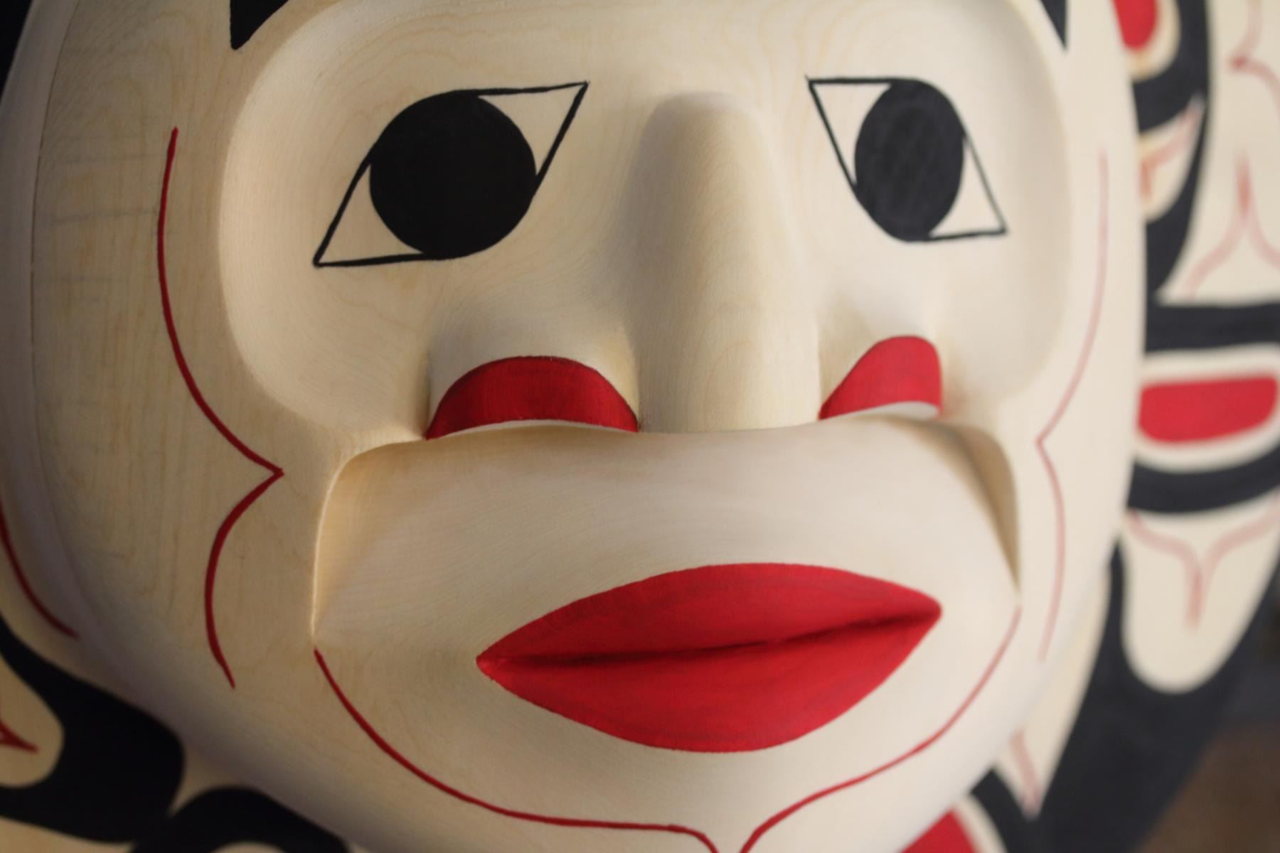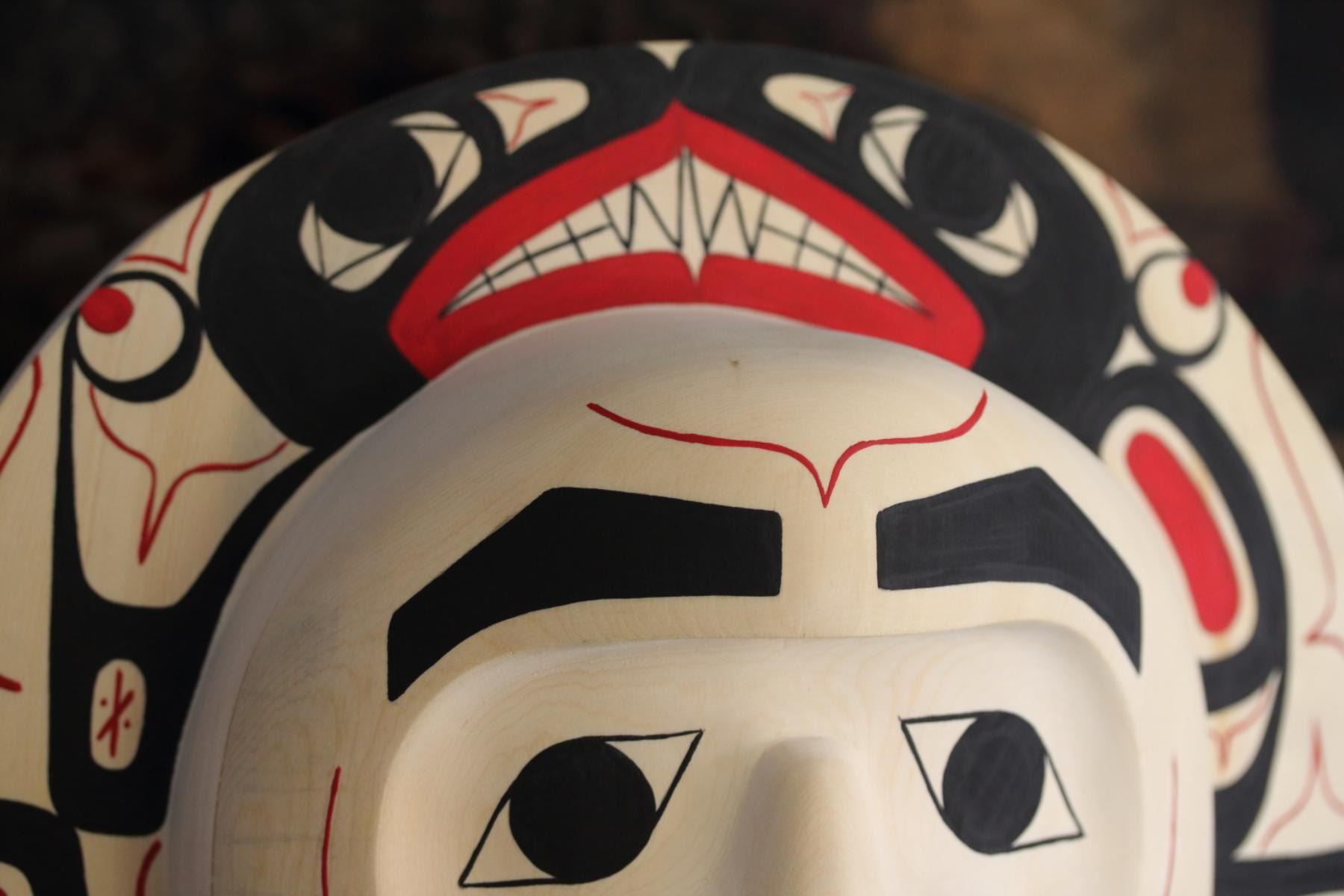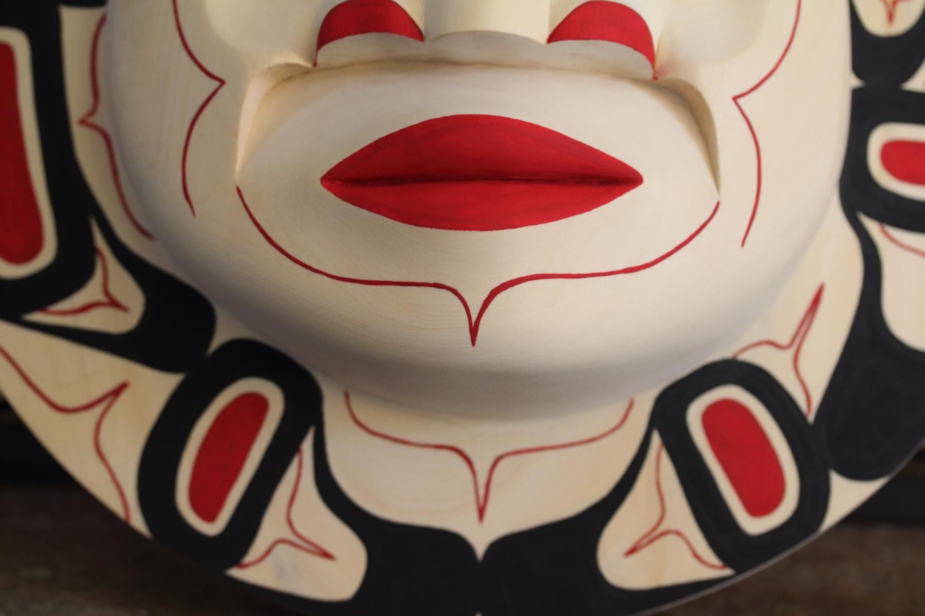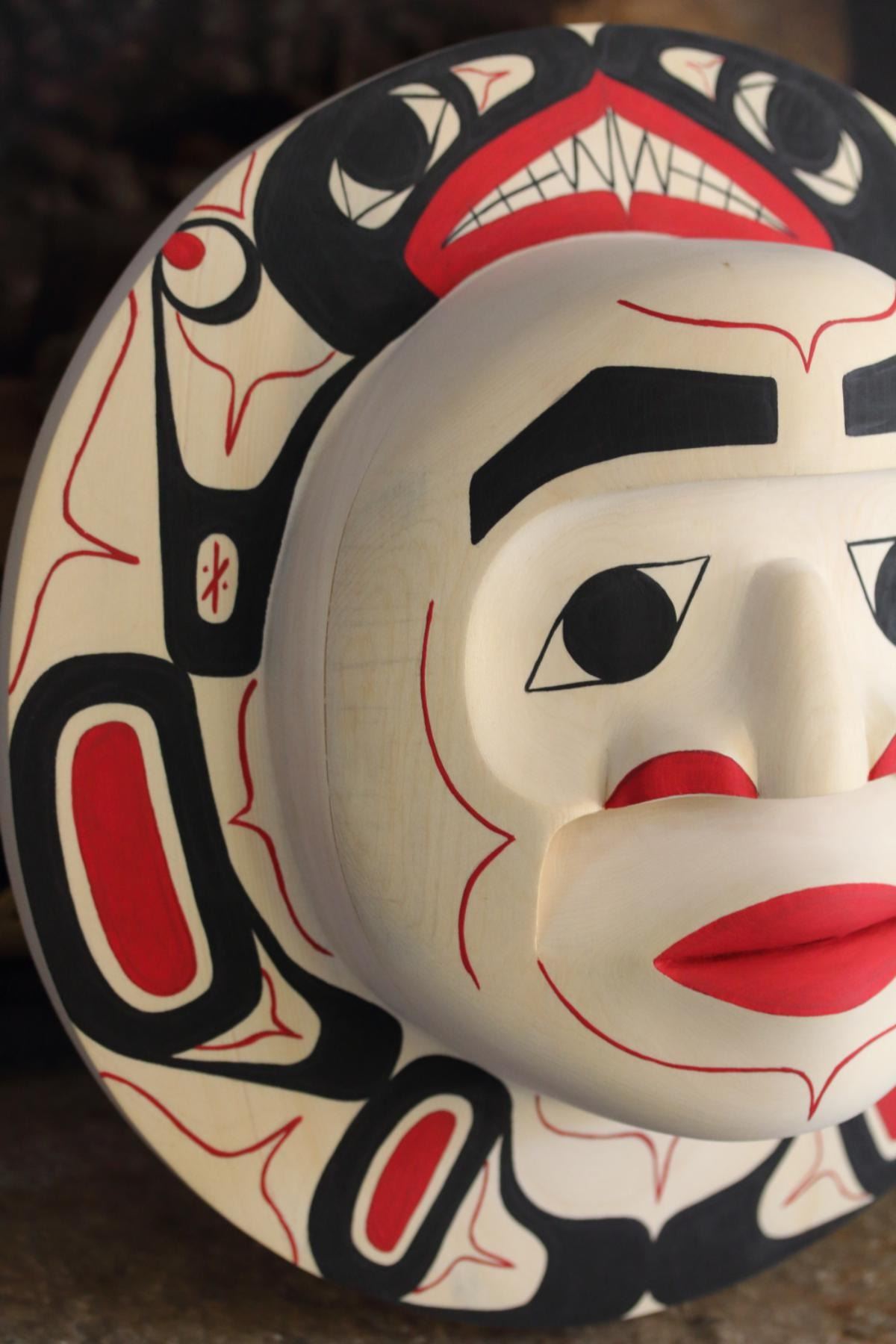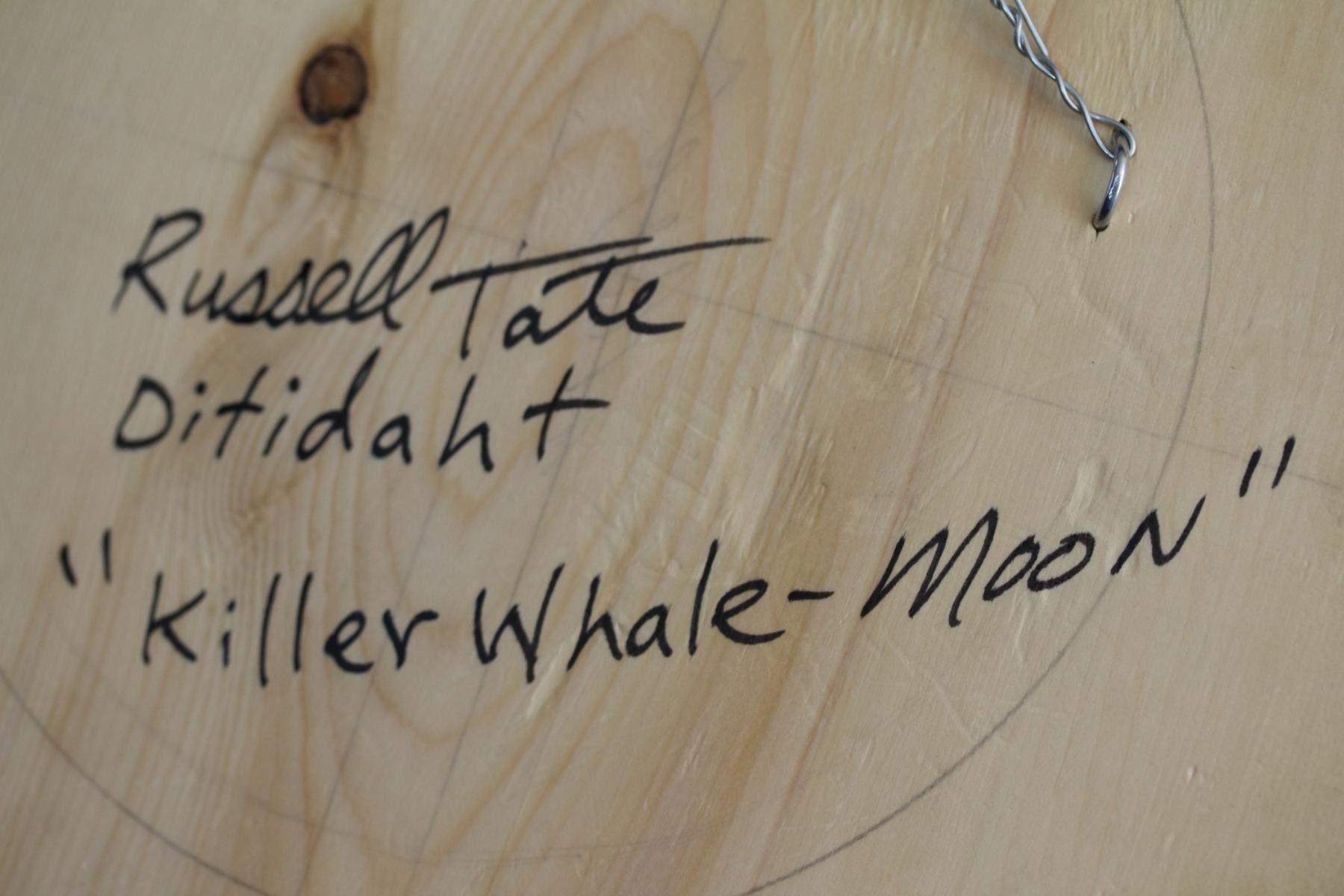 West Coast Native Moon Mask with Killer Whale Spirit....Size -12 inches; Hand Craved on the yellow cedar by First Nation Artist Russell Tate......Russell Tate from the Ditidaht First Nation on the southwest coast of Vancouver Island. He started carving in 2004, artists such as Art Thompson and the artists on the Ravens and Eagles show inspired him. Russell learned how to wood carved mostly working on his own. He specializes in masks and paddles, but is now working on small poles and miniatures for regalia. Russell has worked with Ben David and Cecil Dawson, and has collaborated on several pieces with Cecil