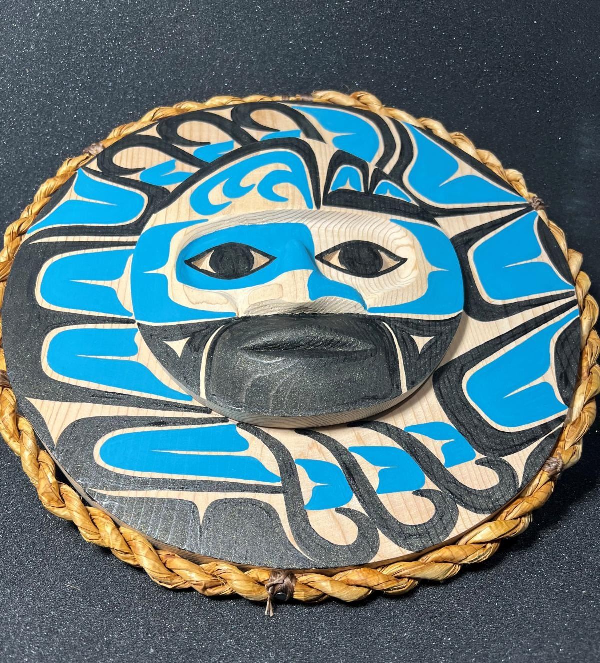 West Coast Native Moon Mask with Wind and Tide Spirit........10 inches in size.....Hand Craved on the Red cedar by First Nation Artist Russell Tate......Russell Tate is from Ditidaht First Nation on the Southwest Coast of Vancouver Island. He started carving in 2004, artists such as Art Thompson and the artists on the Ravens and Eagles show inspired him. Russell learned how to carve wood mostly working on his own. He specializes in masks and paddles, but is now working on small poles and miniatures for Regalia. Russell has worked with Ben David and Cecil Dawson, and has collaborated on several pieces with Cecil Dawson.
