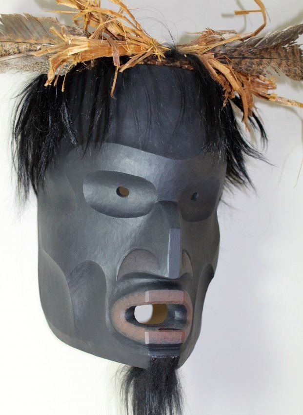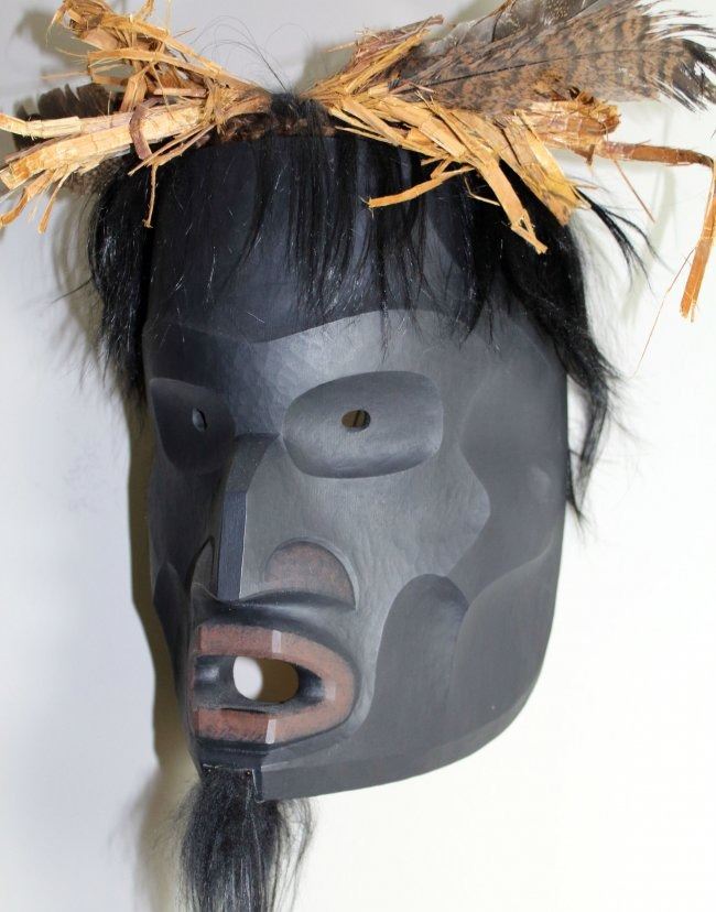 Outh Ma Ko'ik - Wild Man of the Woods - He runs with the wolves. This is a secret society mask used in young man inital rituals. He represents a mythical man who lives in the woods with the wolves. He is a liason between the village and the woods- making sure balance is kept and laws of nature are honoured. Length 12.5" red cedar, cedar bark,feathers mountain goat hairs. msrp 3200 World class first nation artist- Dough David