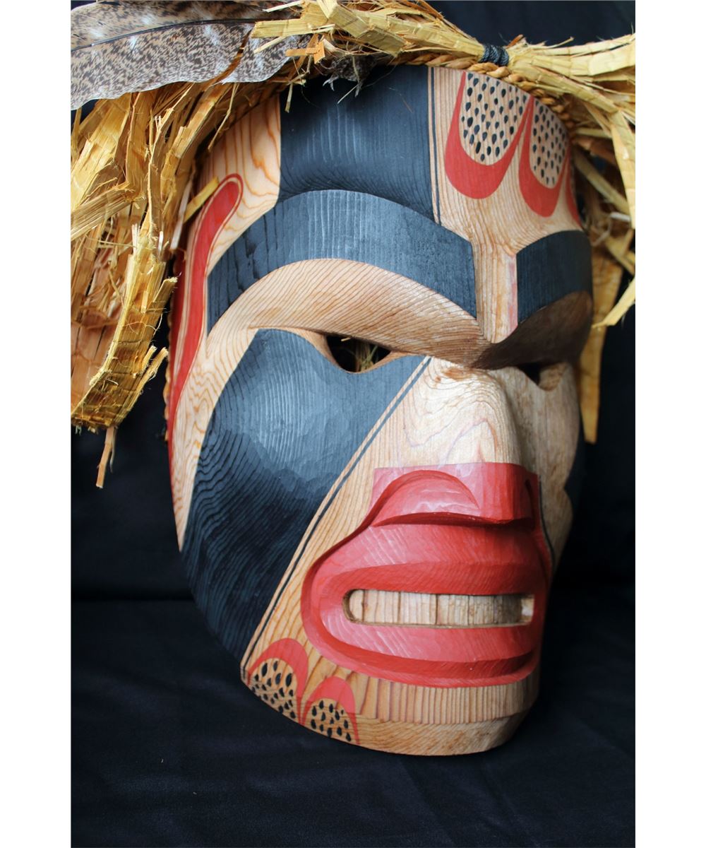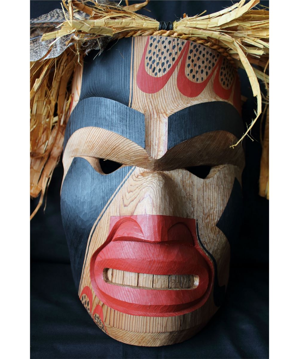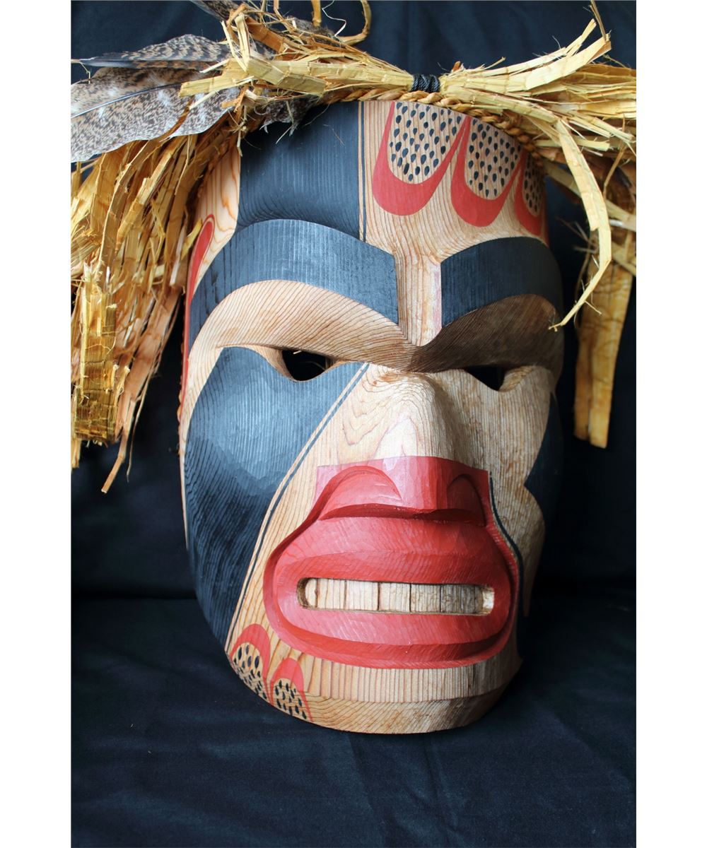 Outh Ma Ko'ik - Wild Man of the Woods - He runs with the wolves. This is a secret society mask used in young man inital rituals. He represents a mythical man who lives in the woods with the wolves. He is a liason between the village and the woods- making sure balance is kept and laws of nature are honoured. Length 13.5" red cedar, cedar bark,feathers & mountain goat hairs. msrp 3200 World class first nation artist- Dough David