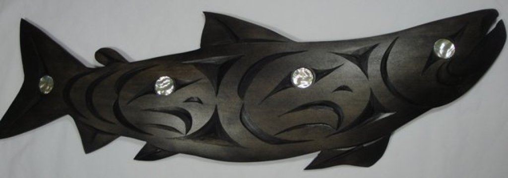 West Coast salish style..... native Salmon....26" long....abalone and nicely carved by first nation artist Brian Bob
