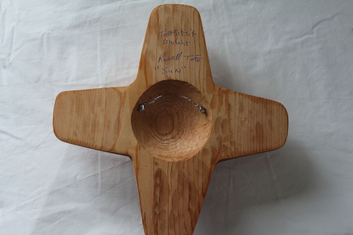 West Coast Native Sun mask with Natural Ruby Eyes..Sun Mask represents Prosperity, brightness, energy and success ...This mask has Natural Ruby eyes......Ruby eyes are over 20 Carats...Size 12 Inch made of Red Ceder.....Artist - Russell Tate. ........Russell Tate from the Ditidaht First Nation on the southwest coast of Vancouver Island. He started carving in 2004, artists such as Art Thompson and the artists on the Ravens and Eagles show inspired him. Russell learned how to wood carved mostly working on his own. He specializes in masks and paddles, but is now working on small poles and miniatures for regalia. Russell has worked with Ben David and Cecil Dawson, and has collaborated on several pieces with Cecil