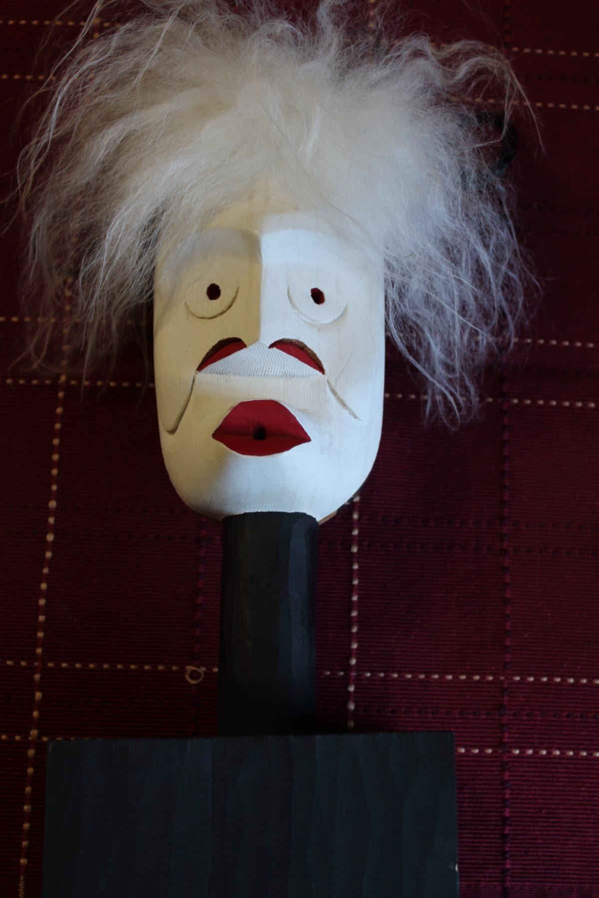 Whale Hunter Spirit carved on both sides, one side represents Whale Hunter spirit Pook Oobs , and other side of Mask rattle is Pook Oobs spirit lost in the winter......13 inch Height ....very nice both side carved face and nicely painted.......both sides got Mountain Goat hairs..Red Cedar Craved by Russell Tate......Russell Tate from the Ditidaht First Nation on the southwest coast of Vancouver Island. He started carving in 2004, artists such as Art Thompson and the artists on the Ravens and Eagles show inspired him. Russell learned how to wood carved mostly working on his own. He specializes in masks and paddles, but is now working on small poles and miniatures for regalia. Russell has worked with Ben David and Cecil Dawson, and has collaborated on several pieces with Cecil