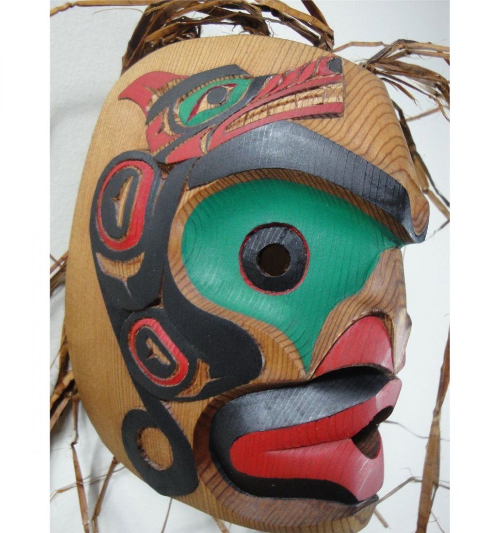 West Coast Native Wit Wok (Chief of the wolves) mask.... red cedar.. 6 inch in height....painted and very detailed carving as you can see in the pictures taken.This mask represents as chief of the wolves and keep an eye on the all human beings to keep law & order in control.made by first nation artist Jimmy Mickey; msrp 1475