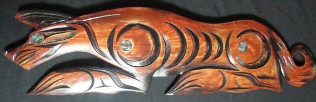 West Coast Native Wolf.....old growth Red Cedar.....21" Length....detailed carving.... abalone....by first nation artist Brian Bob