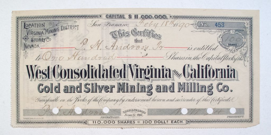 This is a long name for a company that is trying to mimic the success of two of Virginia City's greatest mines. Seems to be named because it is west of the Virginia and California mines. This mine was incorporated in 1887. Certificate is for 100 shares to P. H. Andross, trustee and secretary.City: Virginia CityCounty: StoreyState: NV