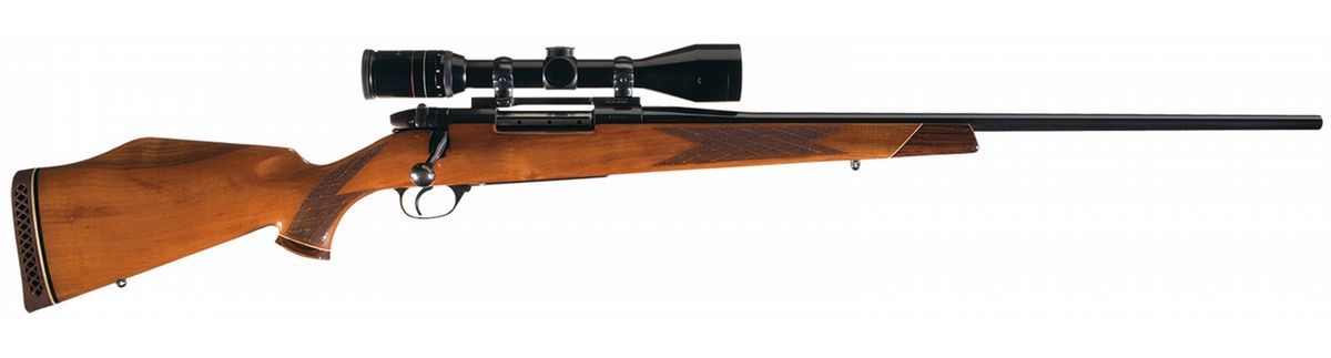Manufactured between 1959 and 1973. There is a Redfield one-piece scope base with a Weatherby Supreme 3-9x44 scope attached to the top of the receiver. Mounted on a skip-line checkered walnut pistol grip stock with contrasting forend tip, contrasting grip cap, raised cheekpiece and factory recoil pad.