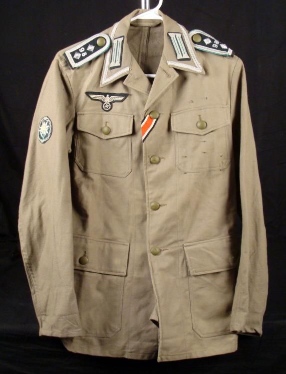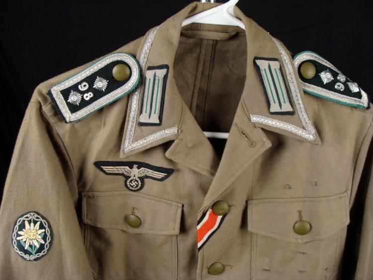 This is a West German Tunic with reproduction Nazi Insignia. These include eagle and swastika and edelweiss patches, shoulder bars with pips, and collar tabs. The size is not marked, but the jacket measures approximately 18" across the chest, and 19" in sleeve length. It is in excellent condition.
