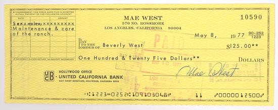 West, Mae (1892-1980) Goldenrod yellow personal check signed "Mae West," 3 x 8¼ in., Los Angeles, CA., May 8, 1977. Engraved with West's name and address and paid to Beverly West in the amount of $125.oo for "Maintenance & care of the ranch. Bank stamps lightly affect the signature, which is boldly signed in blue ink. With publicity photos from "I'm No Angel" and "'Goin' To Town."