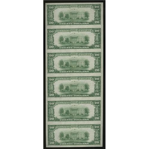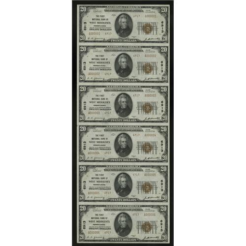 <B>West Middlesex, PA</B></I> - $20 1929 Ty. 2 <B>The First NB</B></I> Ch. # 6913 Uncut Sheet<BR>A lovely uncut Type 2 serial number 1-6 sheet which is one of just two sheets reported from this bank. There are no folds whatever and each note and the sheet itself appears to easily grade <B>Gem Crisp Uncirculated.</B></I><BR><BR><b>Shipping:</b> Coin/Currency (<a target="_blank" href="http://www.heritageauctions.com/common/shipping.php">view shipping information</a>)