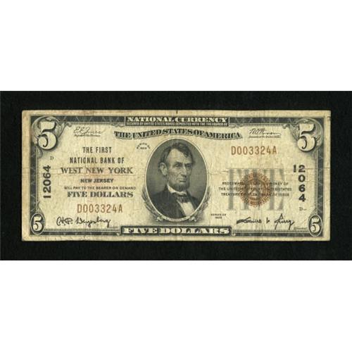 <B>West New York, NJ</B></I> - $5 1929 Ty. 1 <B>The First NB</B></I> Ch. # 12064<BR> Some light wallet staining is noticed on this note from this desirable Hudson County issue. <B>Very Good</B></I>.<BR><I>From The John Ameen Collection</B></I><BR><BR><b>Shipping:</b> Coins & Currency (<a target="_blank" href="http://www.heritageauctions.com/common/shipping.php">view shipping information</a>)