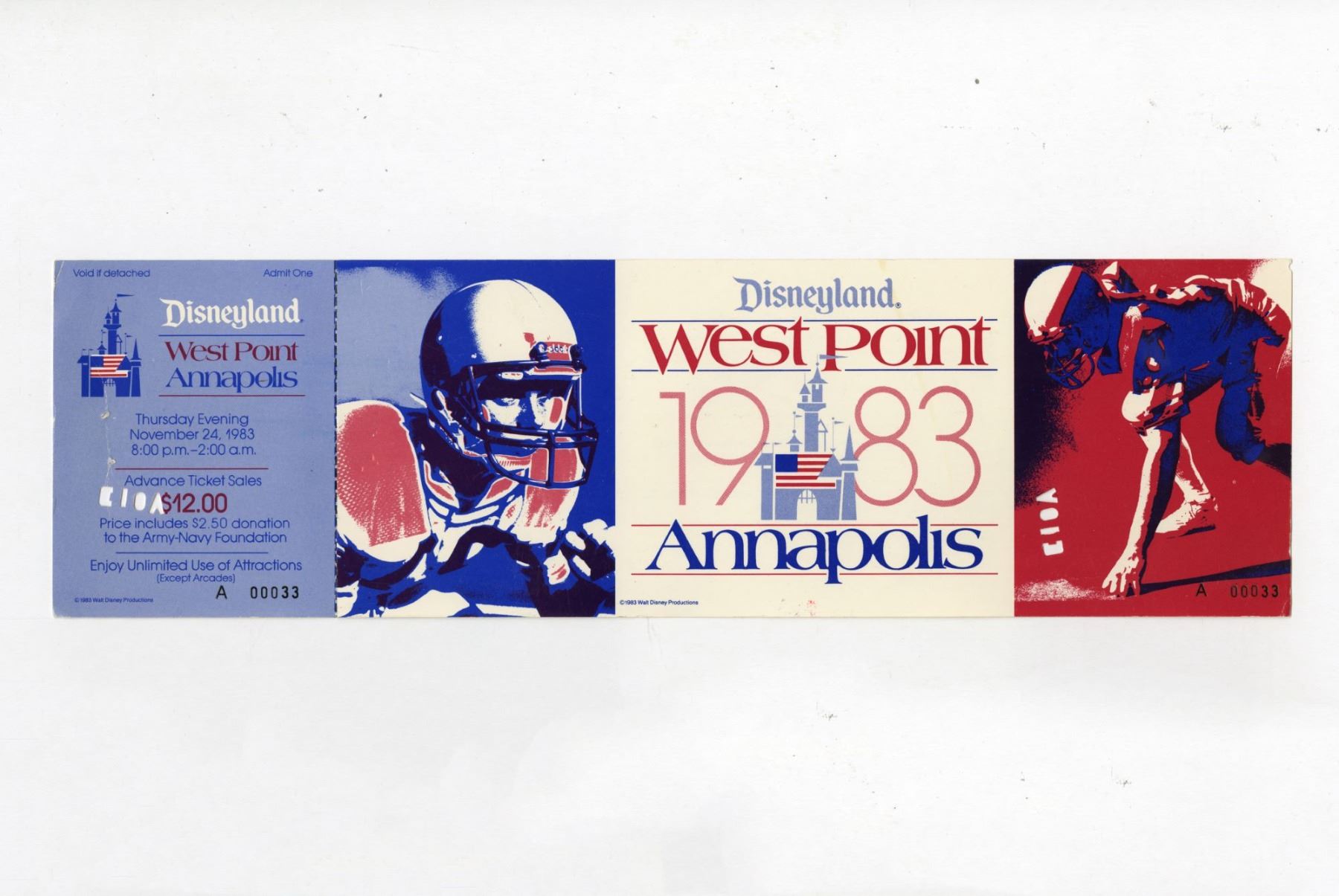 (Disneyland, 1983) A Disneyland event ticket from the 1983 West Point vs. Annapolis Army Navy game. Featuring patriotic red and blue imagery of football players, the ticket has a special event logo with the American flag combined with Sleeping Beauty Castle. The event took place on Thursday November 24th, and the unused ticket still has the admission ticket attached, stamped VOID. Measuring 3.5"x12.25" overall, the ticket is in very good condition with void stamps marking the ticket as used and the perforated line weakened, but not separated.