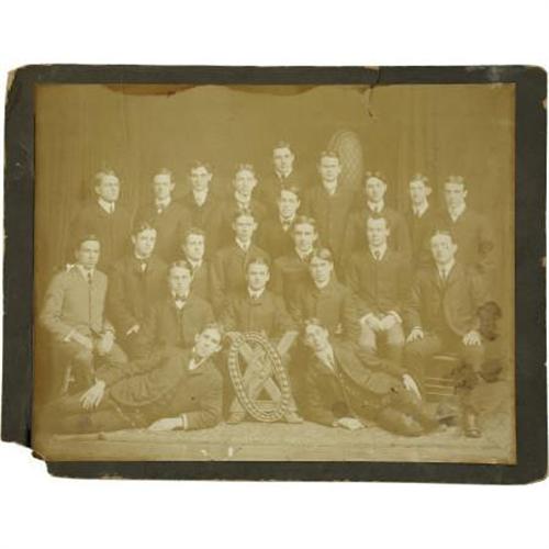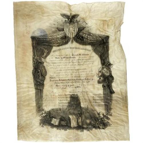 <B>West Point Diploma. </B></I> One page, vellum, 15.5" x 19.25", West Point, New York, June 13, 1900, conferred upon Edward M Adams for receiving a degree in the Arts, Sciences and Literature, and recommending him to promotion in "<I>Engineers, Ordinance, Artillery, Cavalry or Infantry </B></I>". Signed by "<I>Colonel, U.S. Army Superintendent </B></I>", professors and instructors of the United States Military Academy. Buckling and discoloration over page obscuring signatures, military vignettes surrounding the page. Accompanied by 18" x 14" photo of West Point graduates, faded with slight stains in lower right corner, and lower left corner of cardboard backing torn and missing.<BR><BR><BR><b>Shipping:</b> Flat Material, Large (<a target="_blank" href="http://www.heritageauctions.com/common/shipping.php">view shipping information</a>)