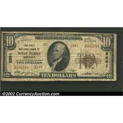 West Point, MS - $10 1929 Ty. 2 First National Bank of West Point Ch. # 2891About Fine, a problem-free circulated note from this scarce Southern locale.