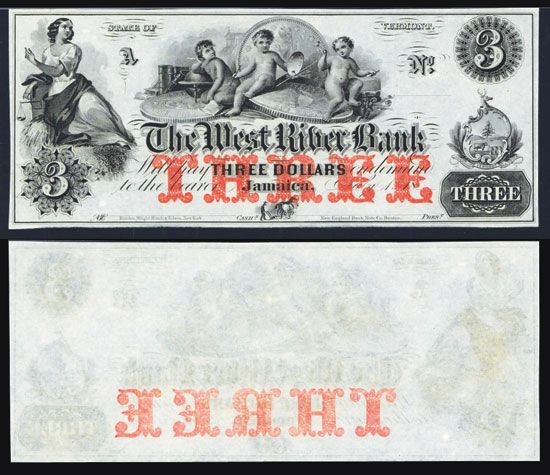 Jamaica, Vermont, 1860's, $3, VT-115-G6b, pp A, No S/N, reclining Justice on left, Cherubs on coins in middle, Arms at right, PMG graded Gem Uncirculated 65 EPQ, cute and popular coin vignette.