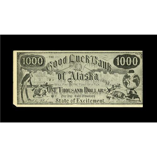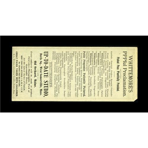 <B>West Somerville, MA and Old Orchard, ME- Whittemore's Up-to-Date Studio Ad Note</B></I><BR>This is a circa 1900 ad note from Mr. Whittemore's photographic studio, utilizing the "Good Luck Bank of Alaska" gold rush format with good ole Uncle Sam. The lower left corner has a small fold and an approximate quarter inch tear. <B>Choice About Uncirculated.</B></I><BR><BR><b>Shipping:</b> Coin/Currency (<a target="_blank" href="http://www.heritageauctions.com/common/shipping.php">view shipping information</a>)