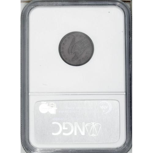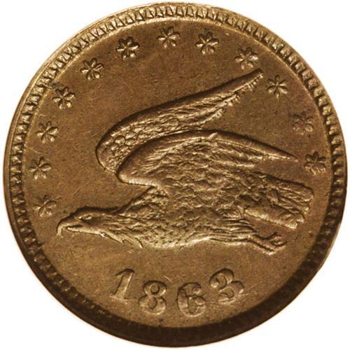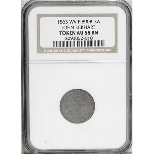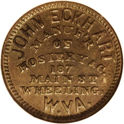 <B>1863 John Eckhart, Fuld-WV-890B-3A, R.8, Wheeling, WV, AU58 NGC.</B></I> The surfaces are chocolate-brown on this R.8 near-Mint State example. Eckhart was a hosiery manufacturer. All West Virginia tokens are quite scarce.<BR><I>From The Troy Wiseman Collection.</B></I>