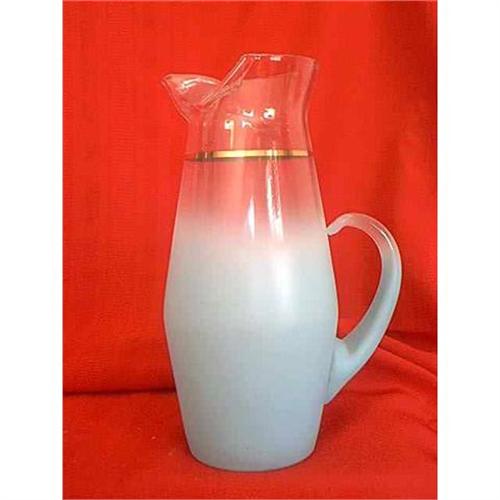 Pitcher by West Virginia Glass is turquoise or aqua from the bottom up to a point then it is clear glass with a band of gold around it. This pretty pitcher is from the Blendo collection. This pitcher is in very good condition with no chips or cracks and measures 11.5 inches high and 7.5 inches wide.