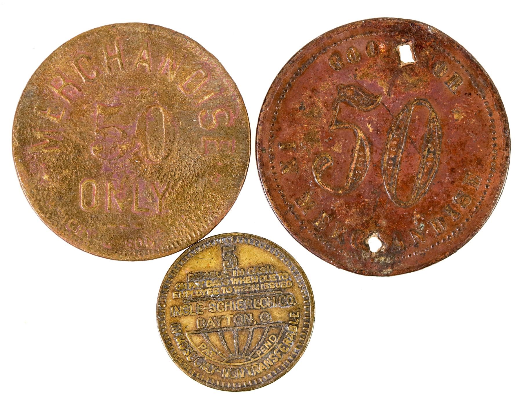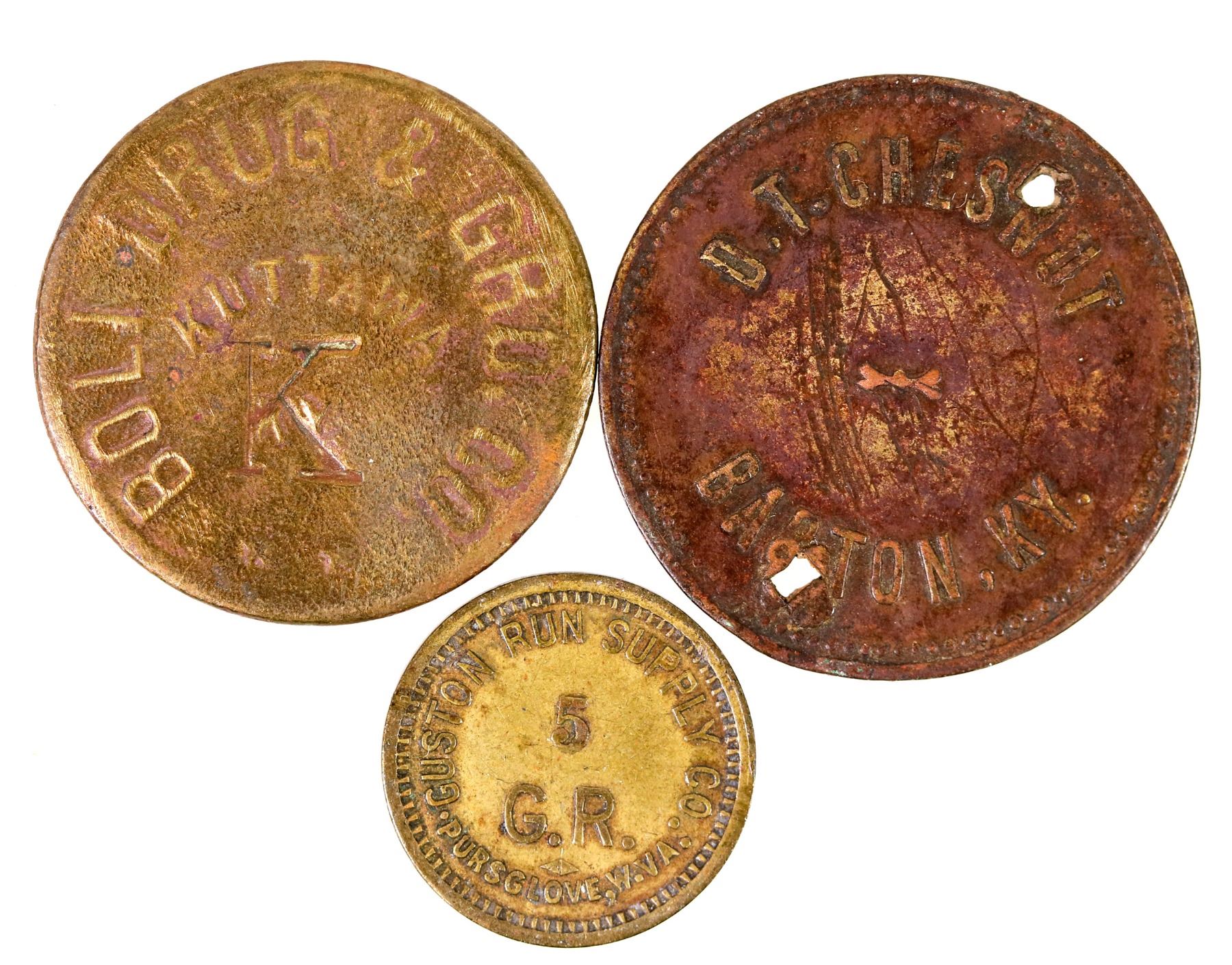 West Virginia/Kentucky Token Trio. D. T. Chestnut, Barton, Kentucky 50 cent, holed at top and bottom; Boli Drug & Grocery, Kuttawa, KY, 50 cent, K counterstamp; Guston Run Supply, Pursglove, West Virginia, 5 cent.