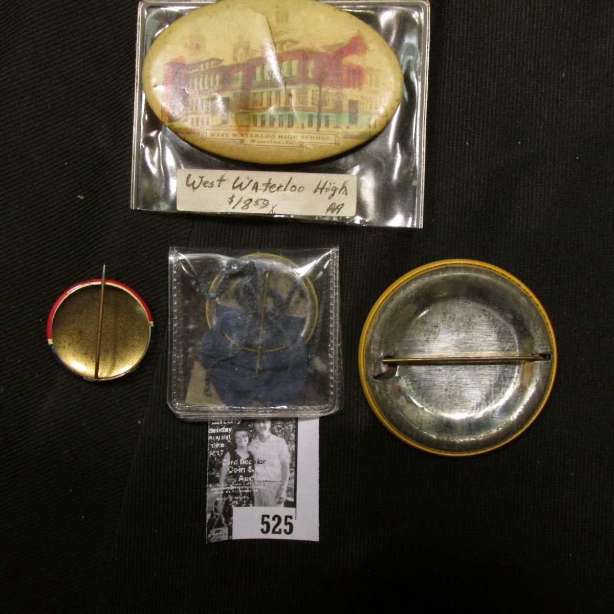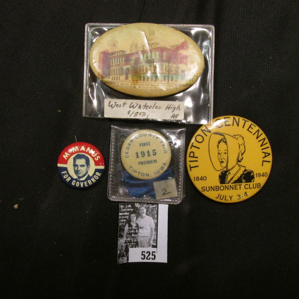"West Waterloo High School" Celluloid Pin-back; "Tipton Centennial 1840 1940 Sunbonnet Club July 3-4" Celluloid Pin-back; "Cedar County Fair First 1915 Premium Tipton, Iowa" Celluloid Pin-back with blue ribbon; & "McManus For Governor" Pin-back.