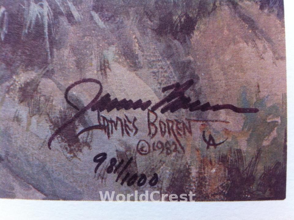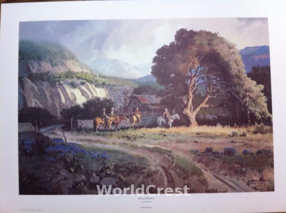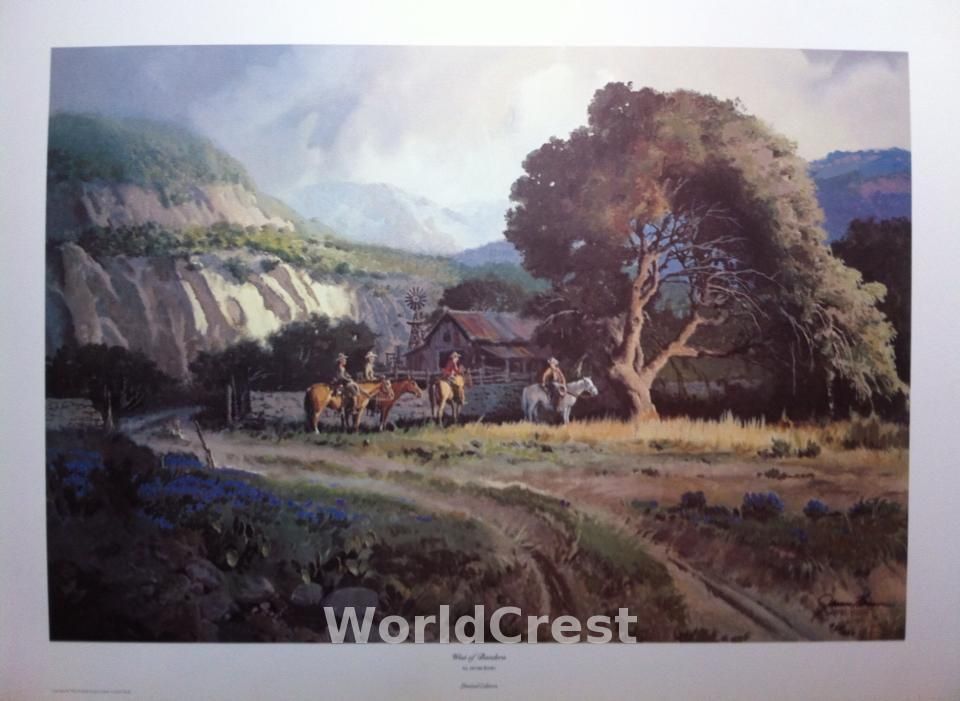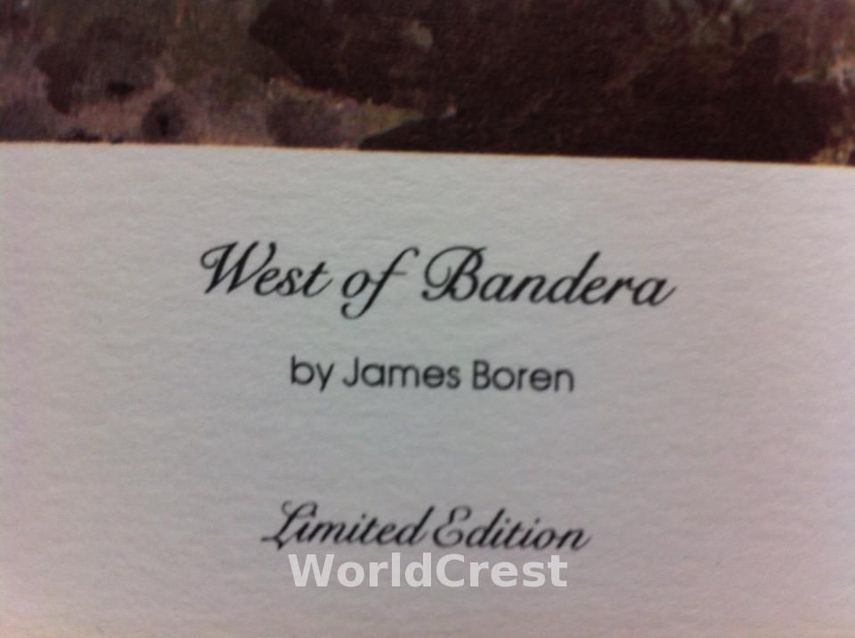"West of Bandera" Limited Edition signed by James Boren 1982 Numbered 981/1000 size: 21" x 28 1/2" Image size: 17" x 24 1/2" James Boren (1921-1990) and his work have served the cause of introducing art to a broad audience of people who were once intimidated by an elite art establishment. There is nothing pedantic about Boren, an open, honest man, and these qualities are reflected in his work. A native Texan, he received a masters degree in fine art from the Kansas City Art Institute in 1951. He taught art for a while and then spent two years traveling in Alaska painting landscapes that he had never imagined during his boyhood in a small Texas town. He continued to develop his technique in his favorite medium of watercolor while doing commercial artwork in Denver. In 1965, Boren became the first art director of the newly opened National Cowboy Hall of Fame in Oklahoma City. Here, among masterpieces of early western, he was inspired to pursue his own fine art ambitions. The young association of western artists, exhibited annually at the Cowboy Hall. Boren was given membership in the group and soon after gave up his position as art director and began to paint full-time. He has been the dominant force in the field of western watercolor ever since. A noted watercolor painter of western scenes and member of the Cowboy Artists of America, James Boren was born in Waxahachie, Texas, the son of a minister. He knew as a teenager that he wanted to be an illustrator but his schooling at Southwestern College was interrupted by military service in the Marines. After the war in 1951, he earned his M F A from the Kansas City Art Institute and then taught for two years at St. Mary's College. In 1959, he began selling cowboy paintings, and in 1964, he became Art Director of the Cowboy Hall of Fame in Oklahoma City. He loved that job because he met so many of the artists he admired. He first exhibited there in 1969 and sold thirty-eight of the forty paintings. This success gave him the confidence to be a full-time painter. He was named Texas State Artist of the Year, and as a member of the Cowboy Artists of America, won the gold medal in watercolor seven times.