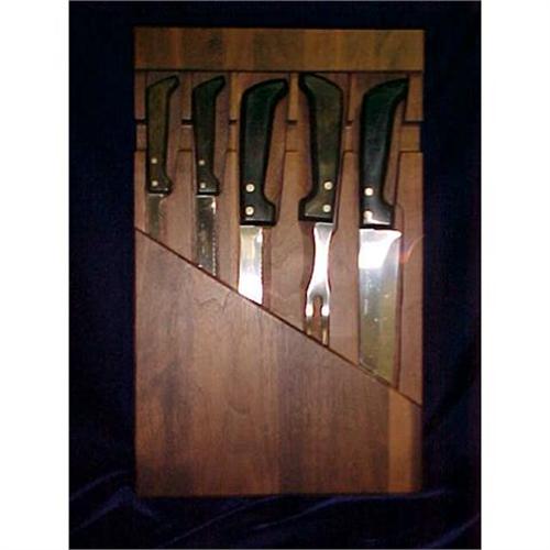 13" chopper/dicer; 10" meat fork; 13" serrated bread knife; 9" serrated multipurpose knife; 7" paring knife. Lighter walnut mounting board. Perfect condition, never used.