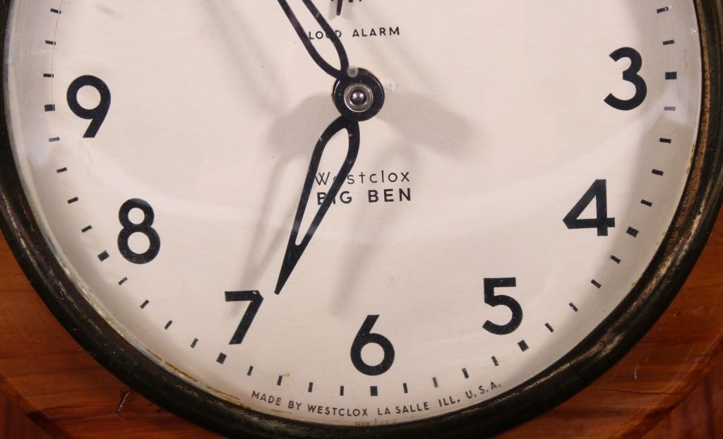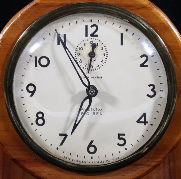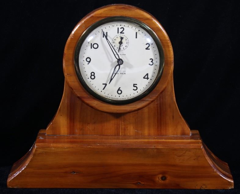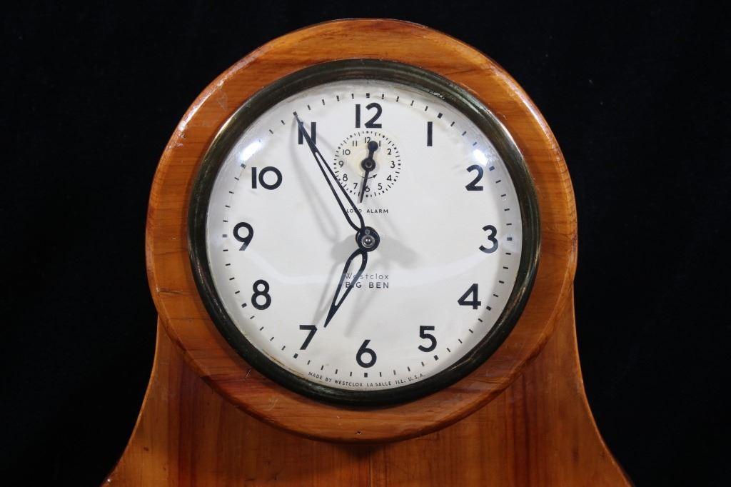 Available in this lot we have a Westclox Big Ben mantle clock originating from the early 20th century. The clock shows solid wood construction with a paper clock face and two key clockwork. The front of the clock is marked "Loud Alarm Westclox Big Ben - Made by Westclox LA Salle ILL. U.S.A.". The piece shows good condition overall with some wear across the piece and a little paint on the side. The clock measures 10" tallby 12" wide.