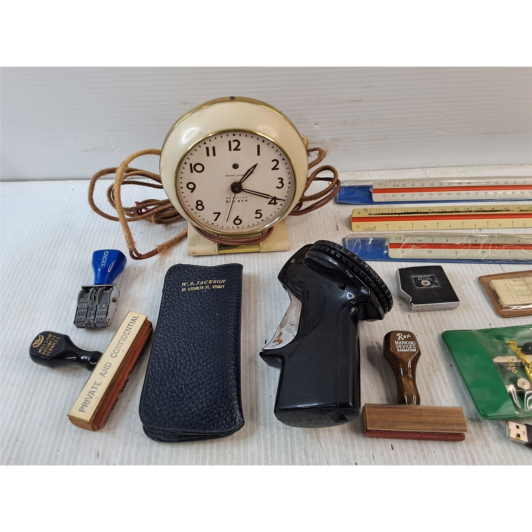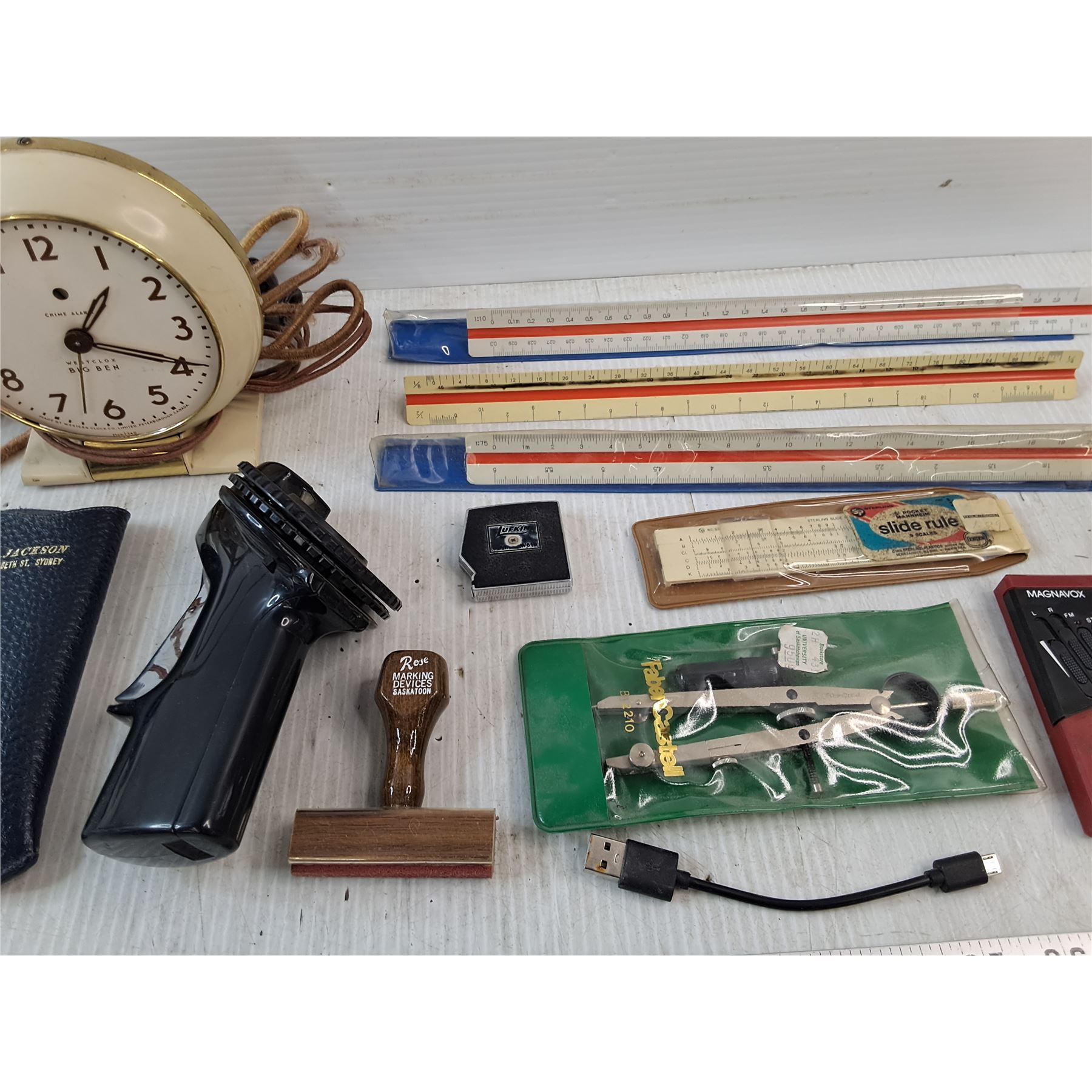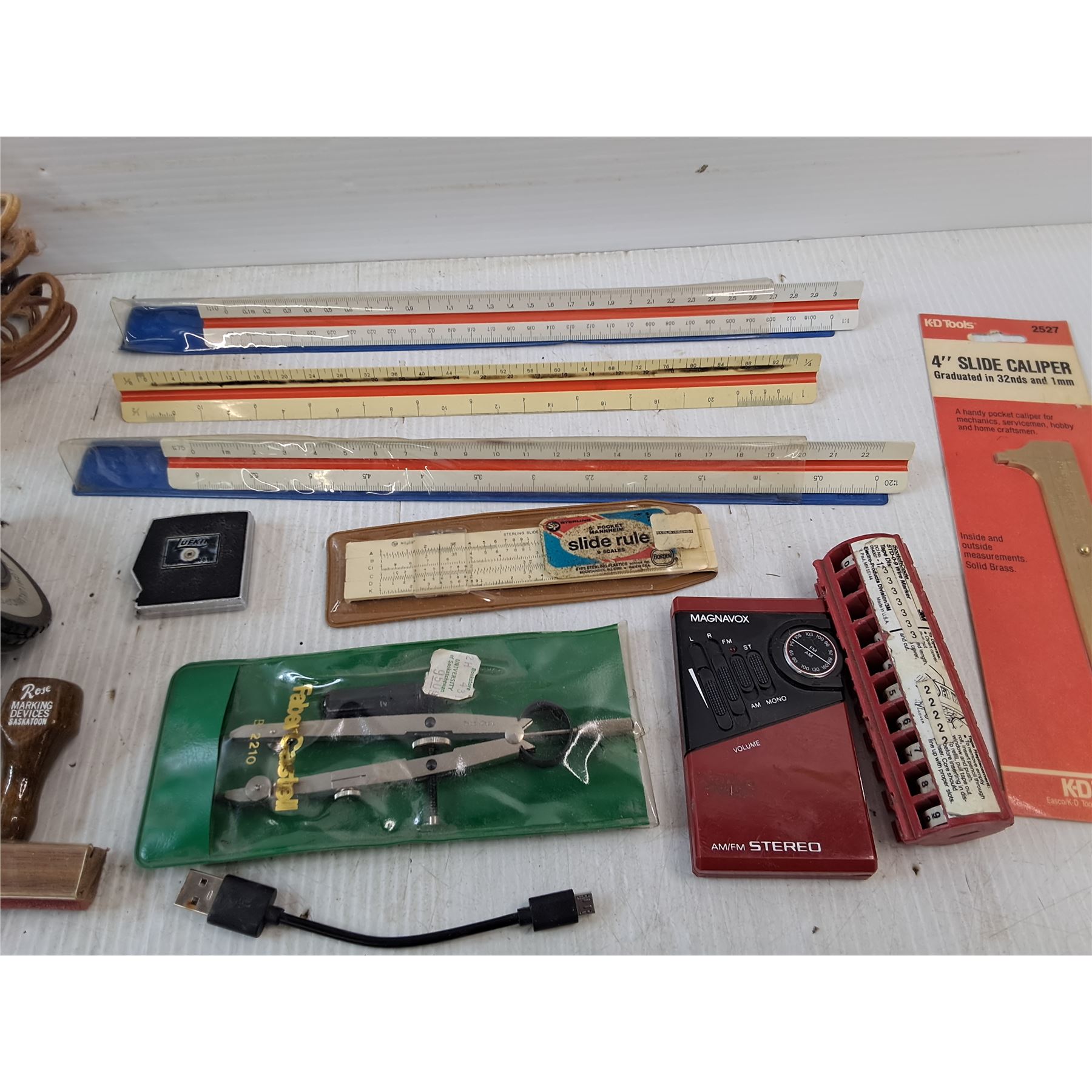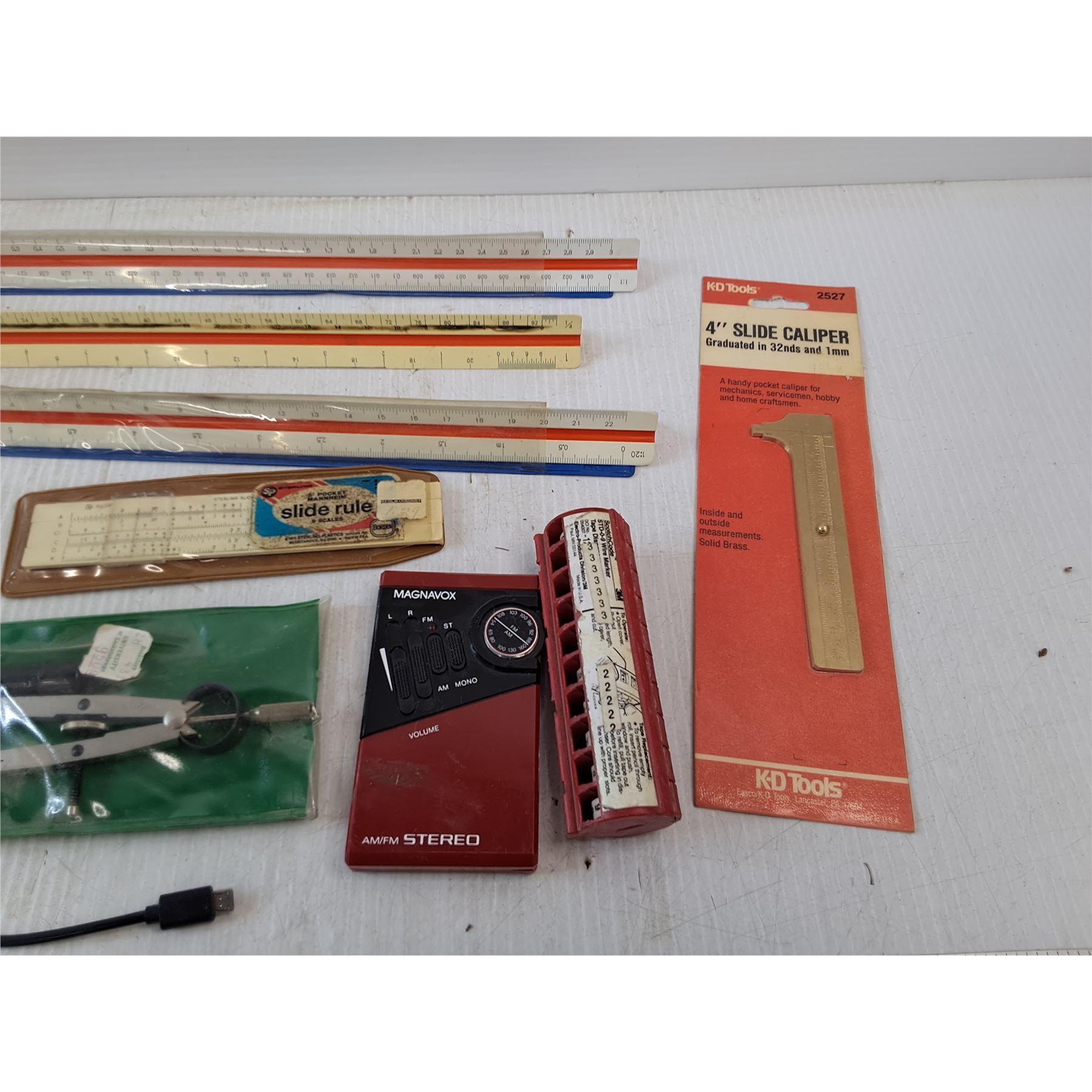 Westclox Electric Clock, Rulers, 4" Slide Caliper,Magnavox Am/FM Stereo, Measuring Tape, Misc