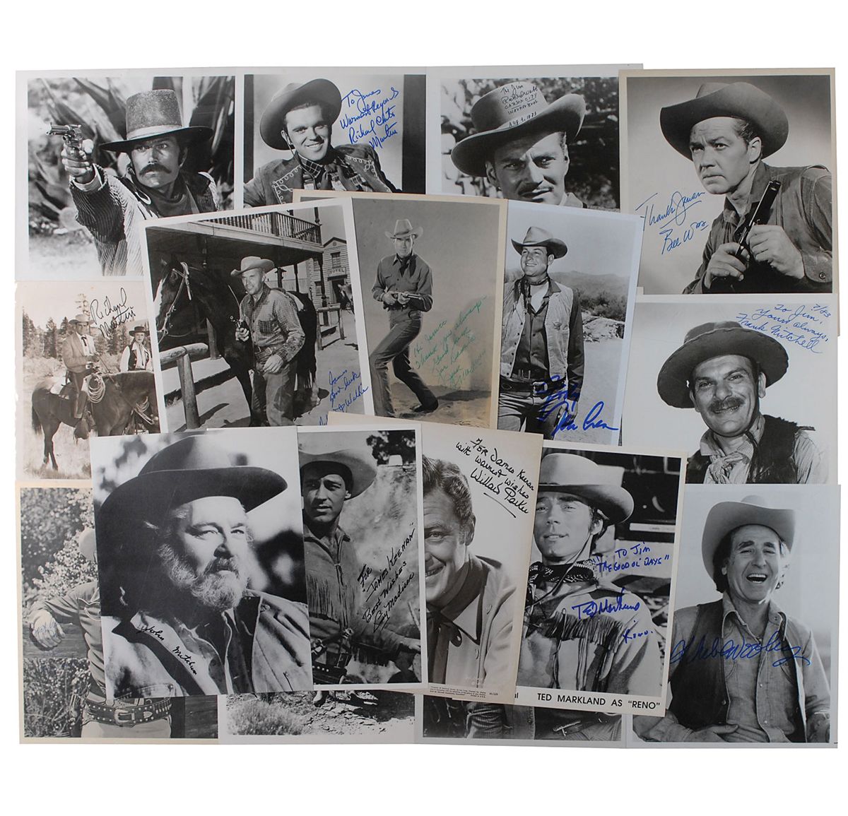 Nineteen photos of various finishes, 8 x 10 and 10 x 8, each signed in felt tip or ballpoint by the western actor pictured, most inscribed to “James.” Signers are: Richard Martin, Jock Mahoney, Richard Webb, Jody McCrea, John Mitchum, Richard Widmark, Richard Martin, Bill Williams, Frank Mitchell, Cameron Mitchell, Guy Madison, Willard Parker, Jimmy Wakely, Ted Markland, Dennis Morgan, Doug McClure, Sheb Wooley, Robert J. Wilke, and Patrick Wayne. In overall very good to fine condition.