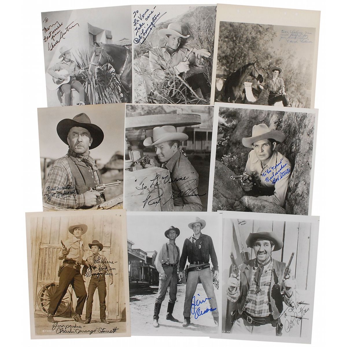 Nine photos of different famous western actors, various finishes, approximately 8 x 10, each signed in felt tip or ballpoint by the actor pictured, most inscribed. Signers are: Bob Steele, Bob Livingston, Rex Allen, Gene Autry, Pat Buttram, William Demarest, Francis Lederer, Jim Arness, and Charles Starrett. In overall fine condition.