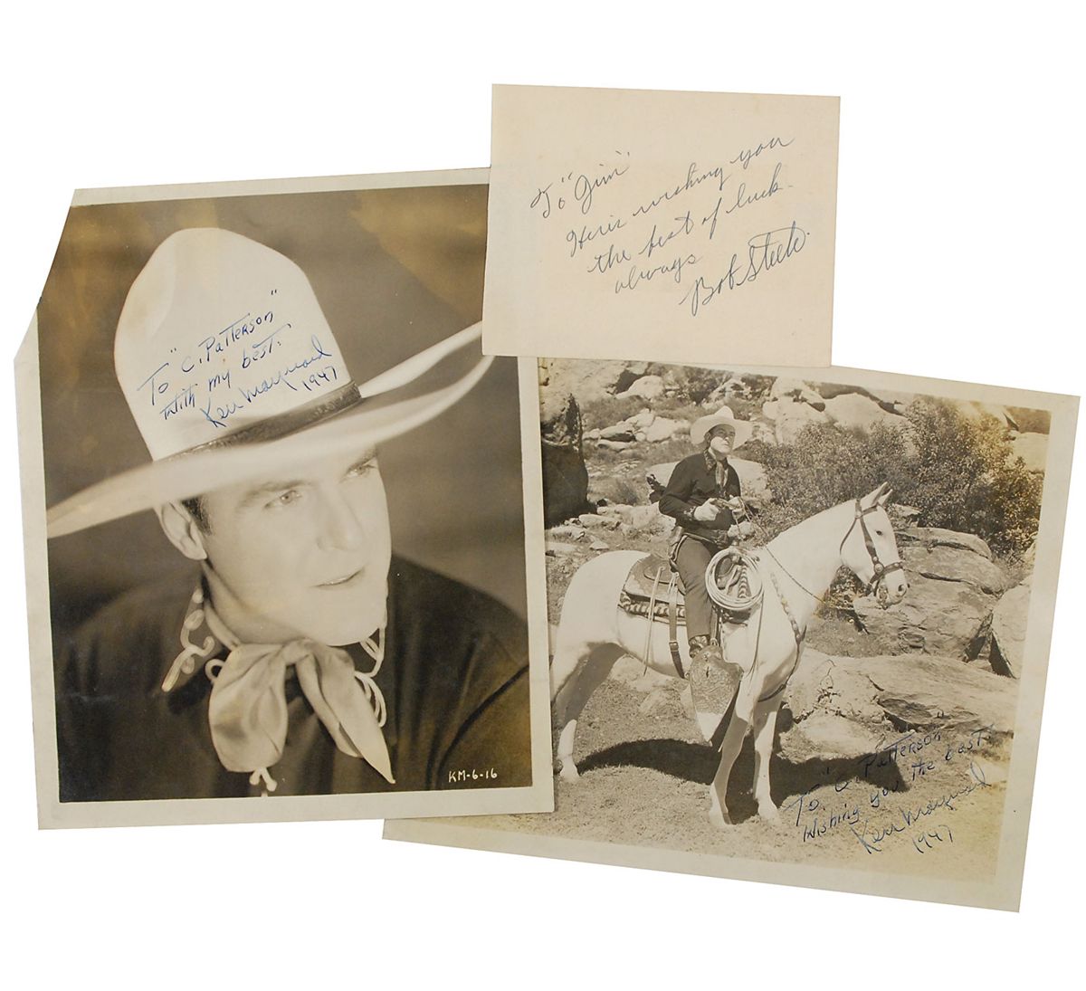Three items: two vintage glossy photos of Ken Maynard, 8 x 10 and 10 x 8, each signed and inscribed in fountain pen and dated 1947; and a fountain pen signature and inscription of Bob Steele on an off-white album page. In overall very good condition, with toning to corners of both photos from mounting remnants to reverse, and the upper left corner of one photo clipped off.