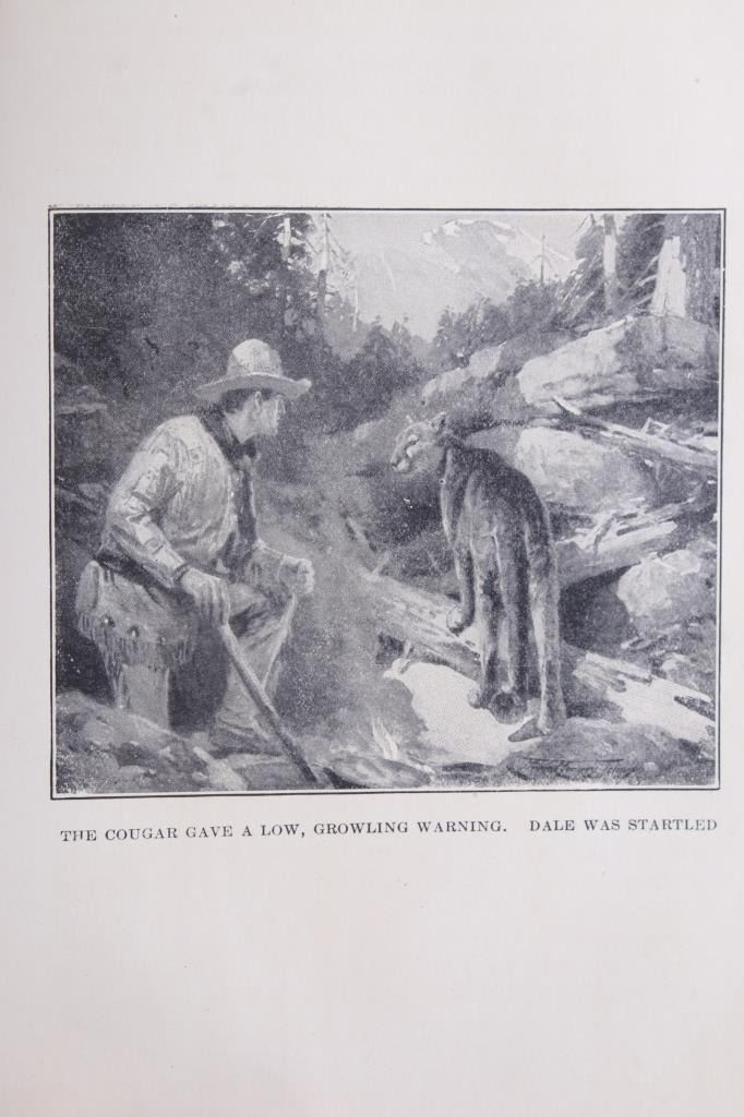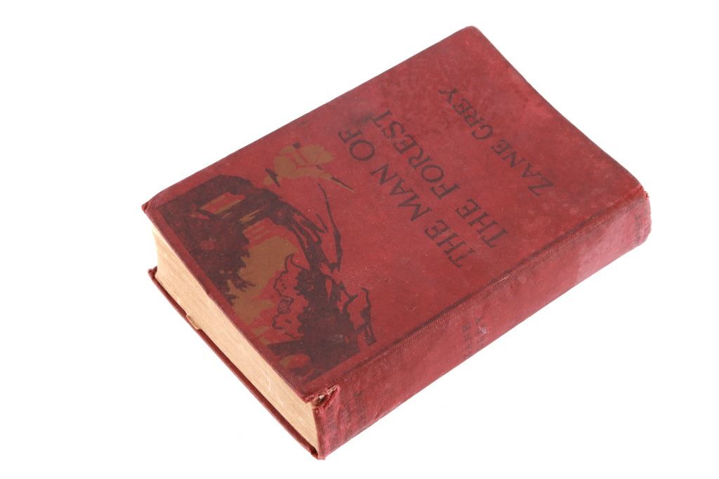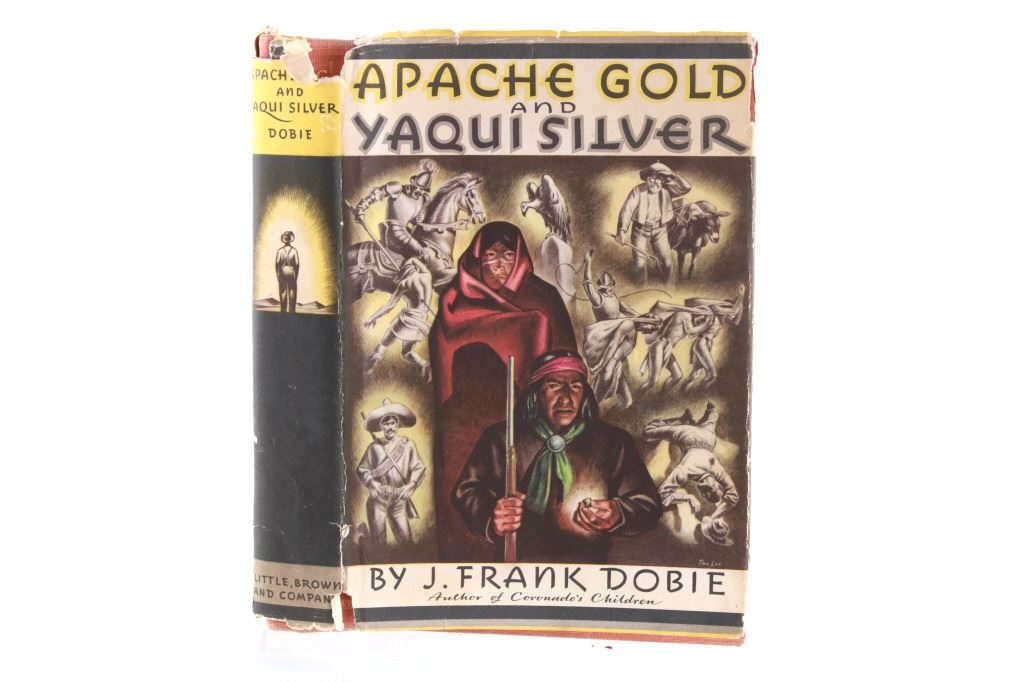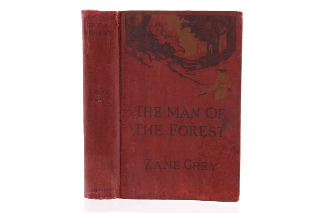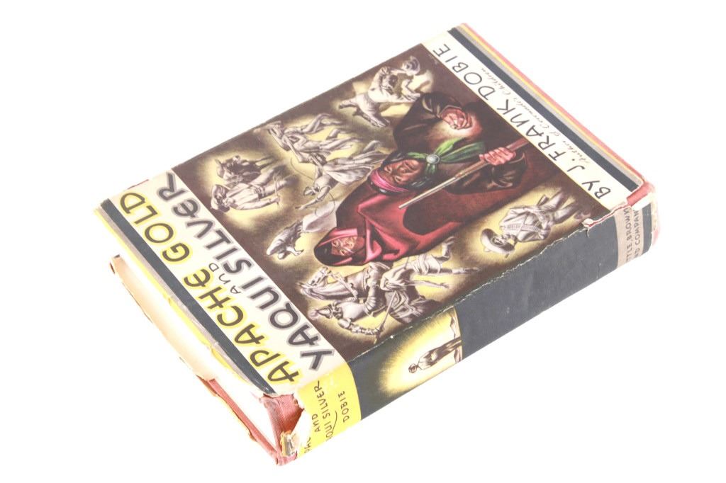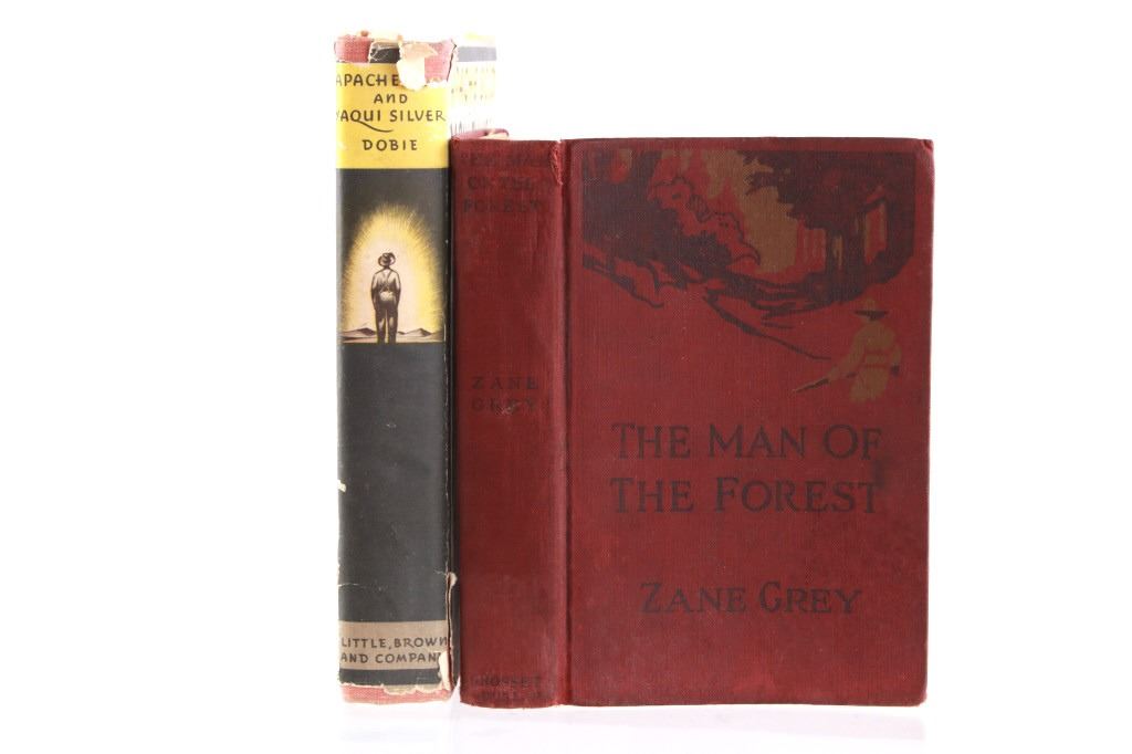 For your consideration in this lot are two vintage books depicting life in the American West. The first book is “The Man in the Forest” by Zane Grey, an American author and dentist, whose romantic novels of the American West largely created a new literary genre, the western; he idealized the American frontier. This hard cover is a 1920 1st edition from Grosset & Dunlap. The book does not appear to have been read as pages do not show normal wear from reading. The pages are yellowed due to aging; none appear torn, though it appears the red hard cover was once wet and there is red ink bled along the page edges. The second book is the Western compilation, “Apache Gold and Yaqui Silver”, by J. Frank Dobie. "The most adept and colorful raconteur of the folklore of Texas and Southwest" is what J. Forrest McCutcheon says about J. Frank Dobie, a cowman, author, college professor, treasure hunter, Guggenheim fellow, and visiting lecturer to Cambridge University in England. The book appears to be in good condition with normal yellowing due to age; the pages and cover appear intact and sans damage; dust jacket has tears and is affixed to inside of the hard cover with tape. The books measure approximately 7.5" L x 5" W x 1.25" D and 9" L x 6" W x 1.5" D respectively.