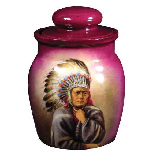 Hand painted ceramic humidor with Native American chief in full head dress. No chips or cracks, excellent condition. 4 1/2 inch diameter X 7 1/2 inc tall