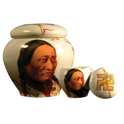 Porcelain humidor with Native American Indian and Indian swastika detail. No chips or cracks, excellent condition. 5 1/2 inch diameter X 5 1/2 inches tall.