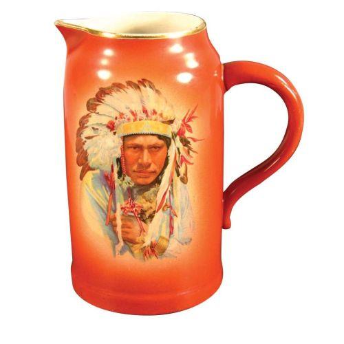Porcelain milk pitcher depicting Native American. Stamped W.H. Tatler Decoration Co. No chips or cracks, excellent condition. 8 inches tall.