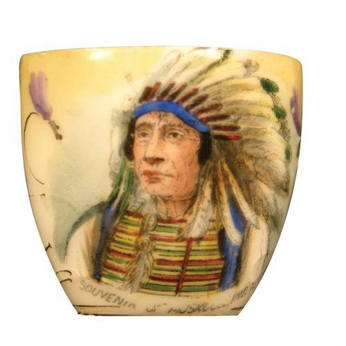 Porcelain miniature tea cup depicting Native American, marked Muskogee Indian Territory. Stamped crown over B.R.C. No chips or cracks, excellent condition. 1 7/8 inches tall.