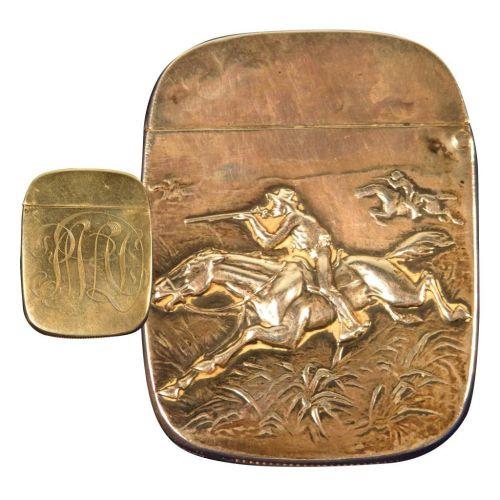 Match Safe Sterling Silver depicting cowboys on horseback shooting rifles. Monogram on back is PML. Excellent condition. 2 X 2 1/2 inches.