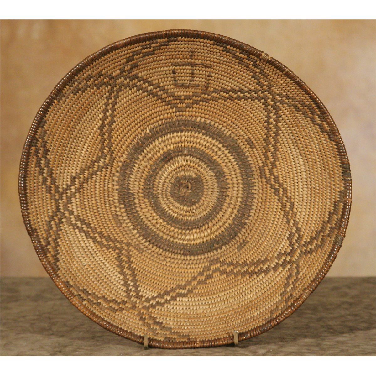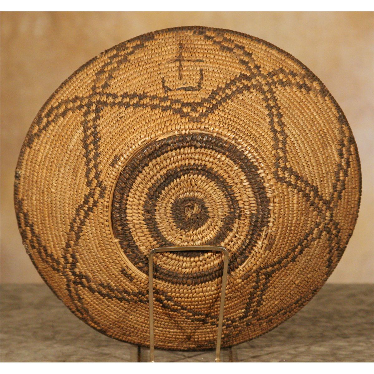 Western Apache Basket. 11" diameter x 3" tall. Coiled basket with geometric designs and religious elements. Circa 1930s.