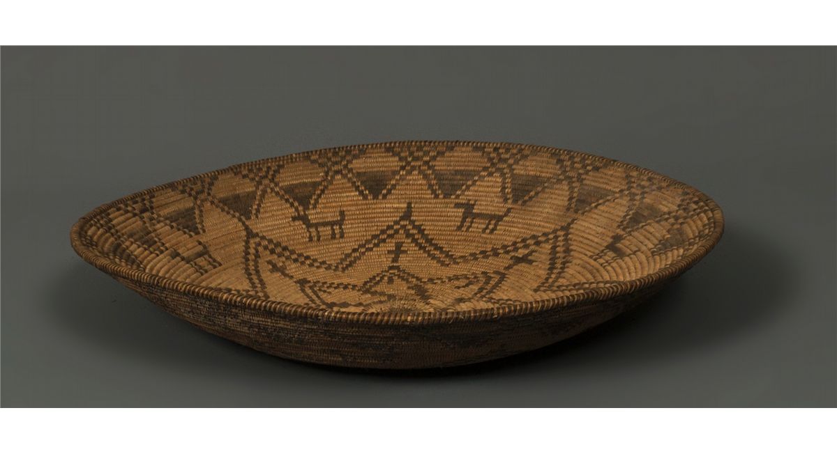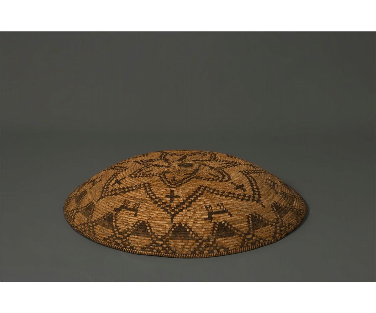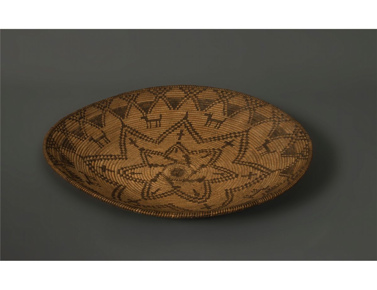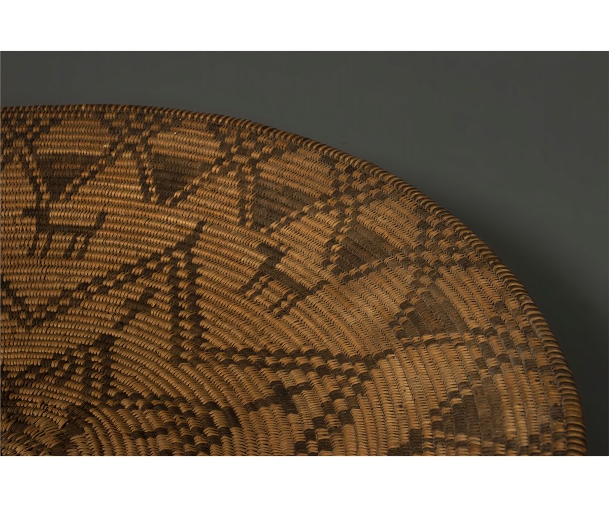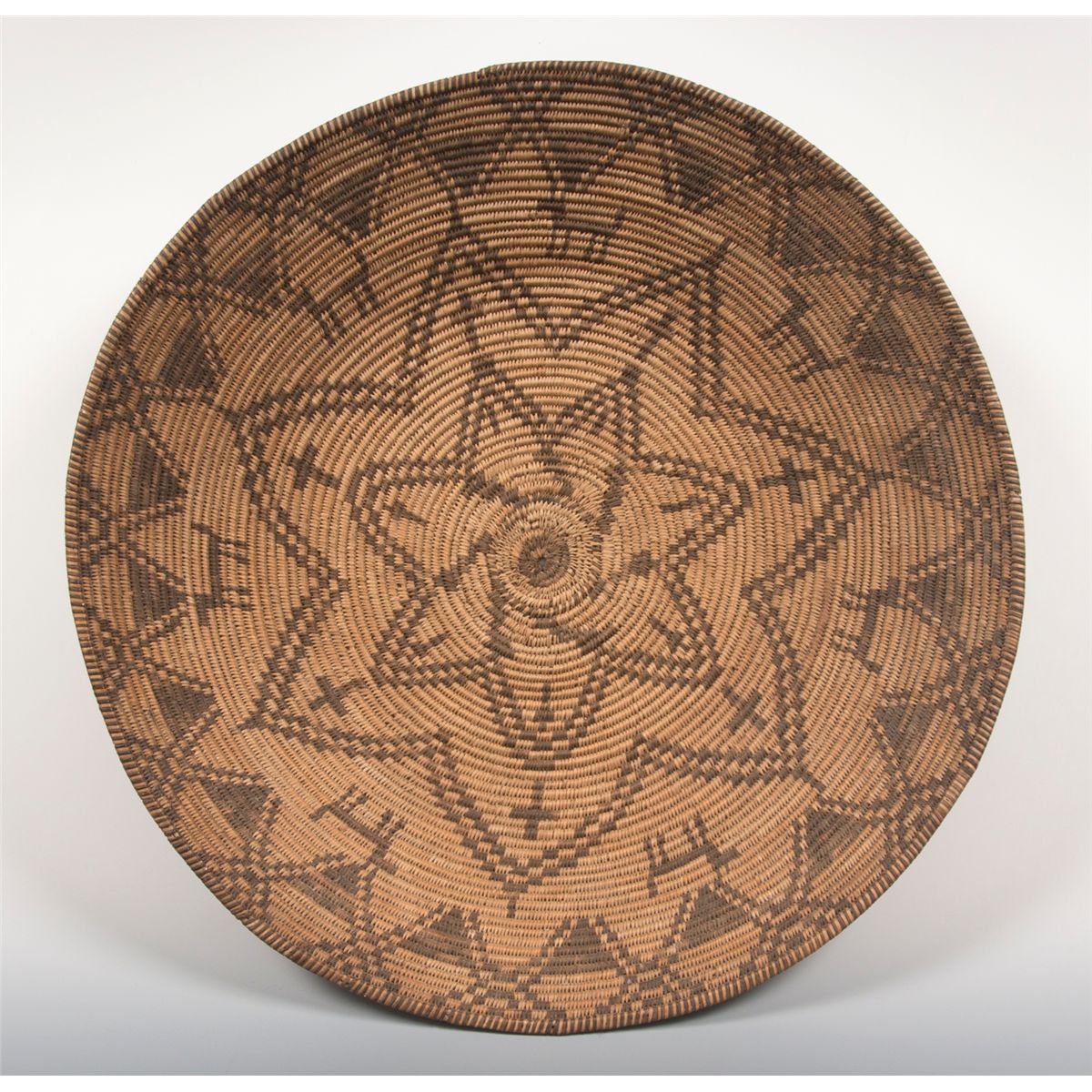 Western Apache Basketry Tray. 20.5" diameter. Snowflake designs, separated by rows of dogs and crosses. Striped edge border. Old Indian repair in the center. Circa 1910.