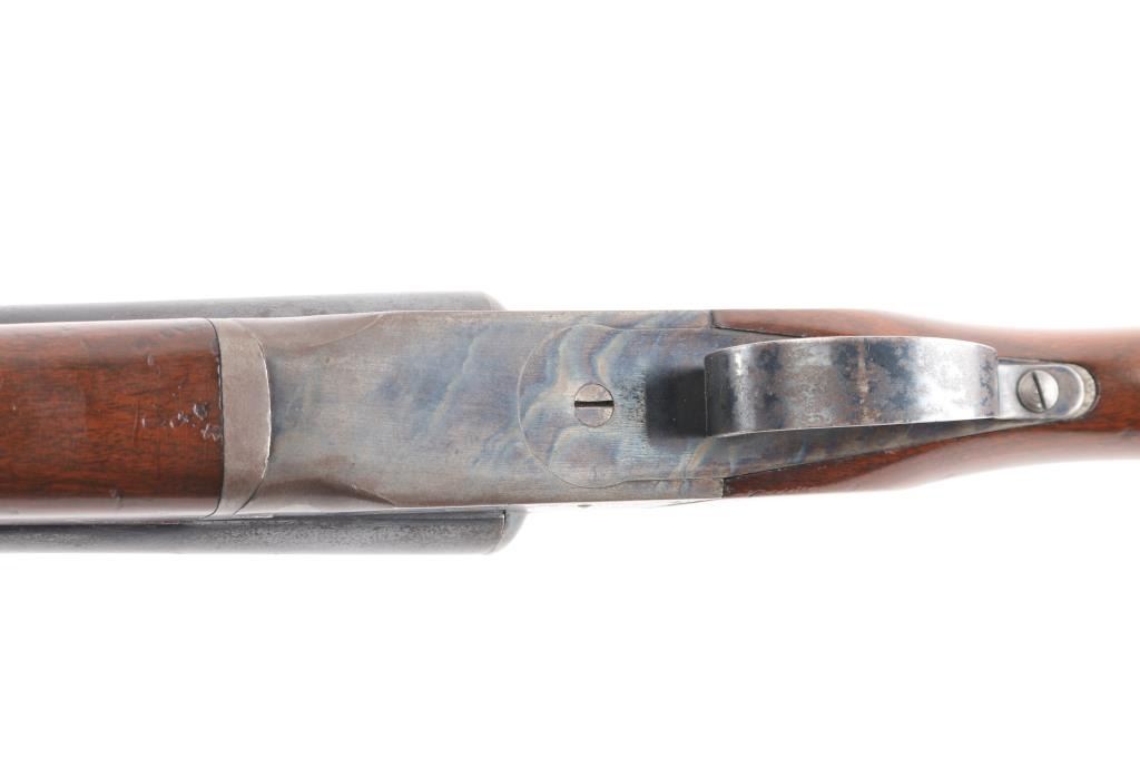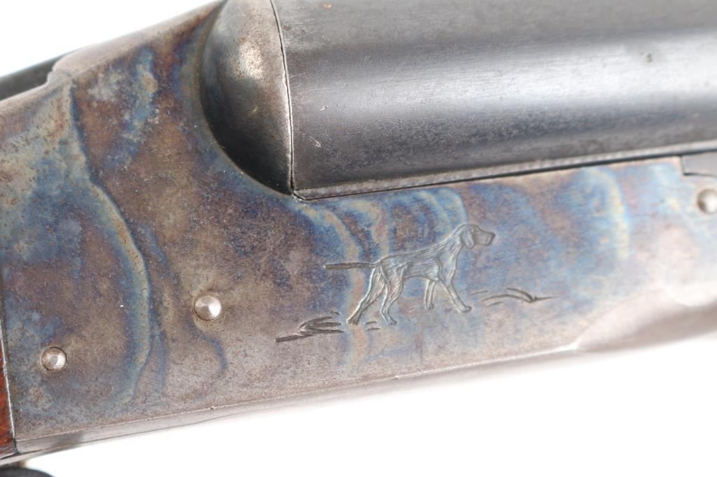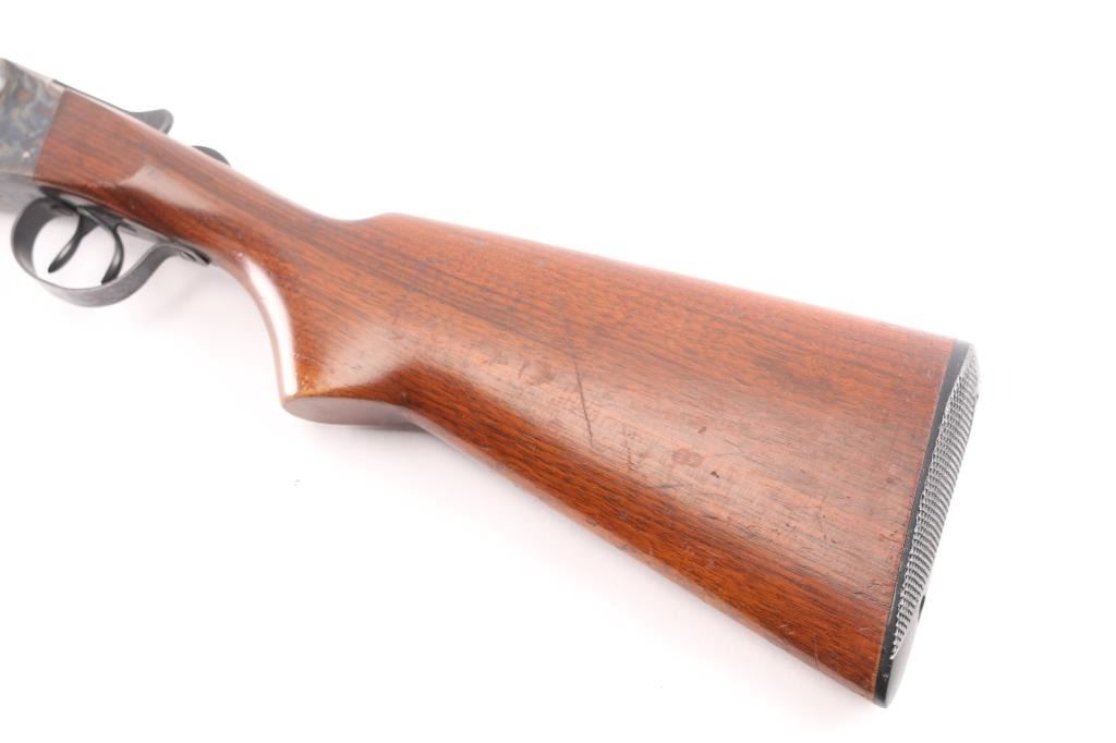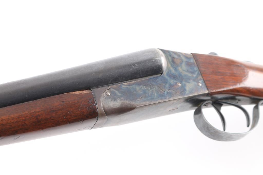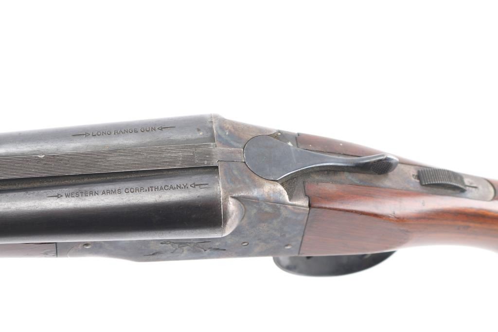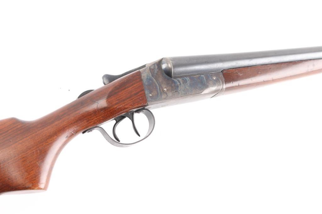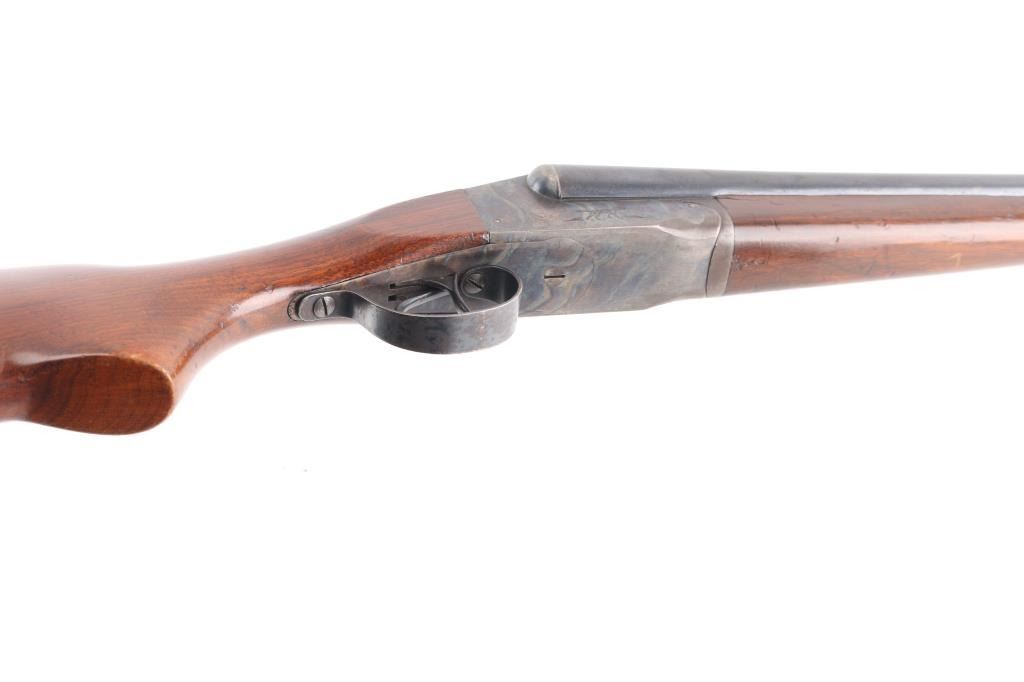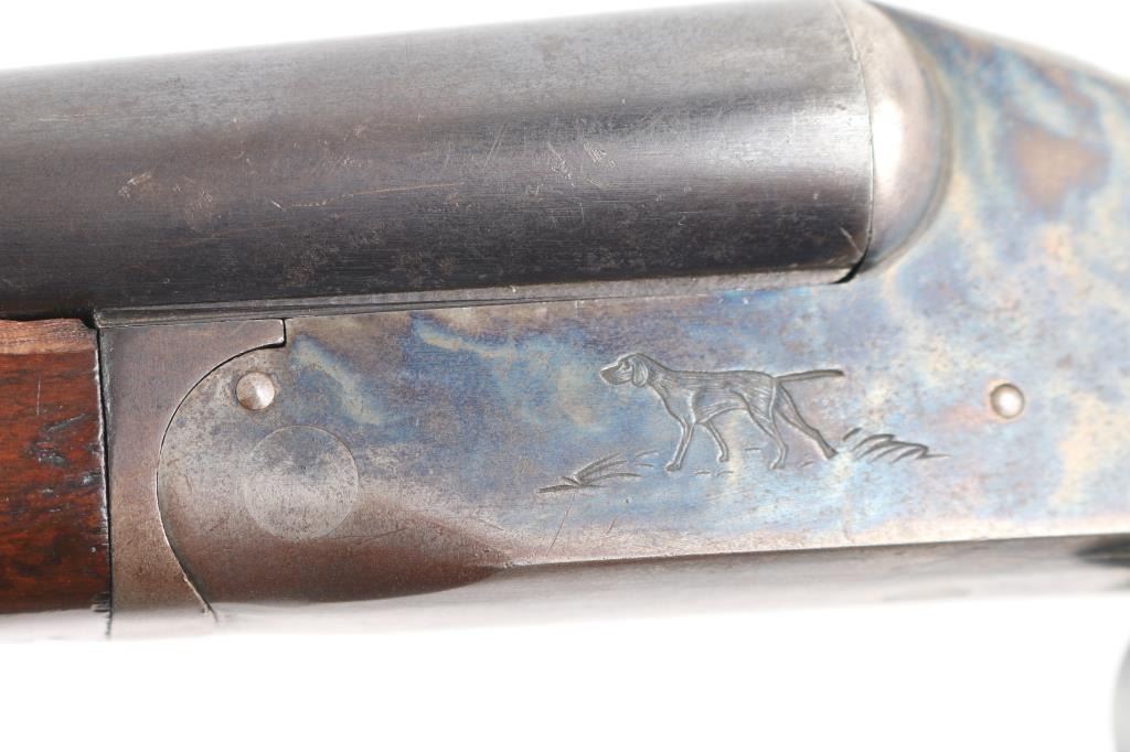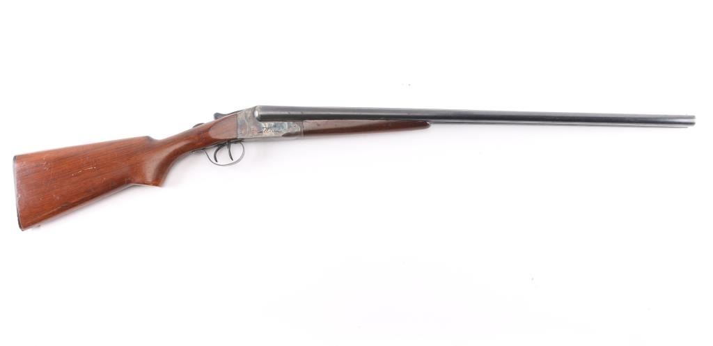 #32341.Vintage double barrel side-by-side shotgun chambered for 2 3/4" 12 gauge shells, circa 1929-1939. Features a blued finish, 28" barrels with a raised solid rib, single extractor, bead front sight, double triggers, sliding tang safety, pointers engraved on both sides of the receiver, checkered top lever, smooth walnut forend and pistol grip shoulder stop with back hard rubber buttplate. Shotgun retains approximately 85% of its finish with muzzle wear/minor scratches. case color receiver is mostly all there with handllng wear on the edges. Action is sound, bores are excellent and refinished wood stocks are very good/sound with minor scratches/dings. There is some scattered light pitting on the triggerguard. Produced 1929-46. LOP-14" to front trigger. Left choke measures CYL, right M.NRA Condition-Good. C&R Firearm.