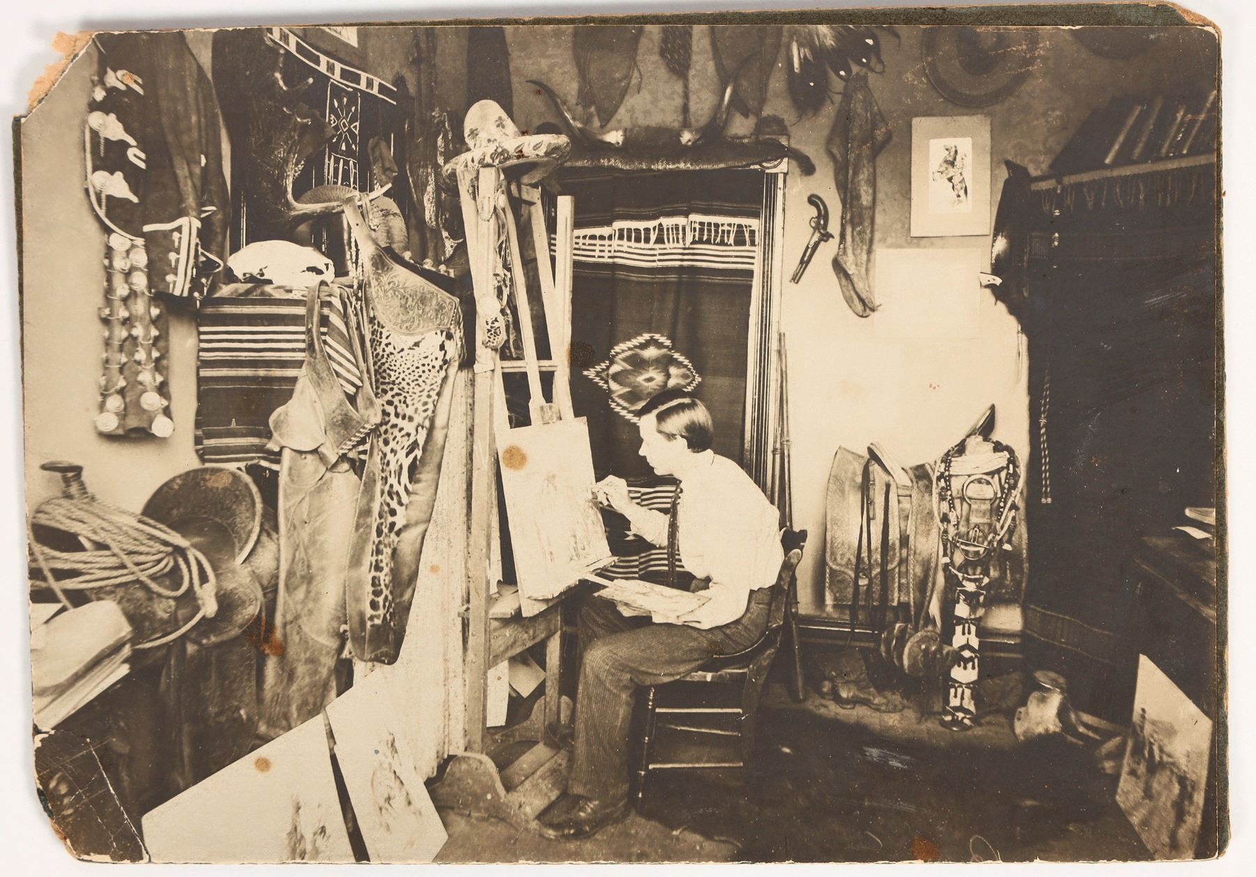 B/W photo, 5x7", artist seated at easel and surrounded by western gear and art works in Oakland, Calif. Possibly Maynard Dixon (1875-1946) Known for Southwestern art and considered one of it's finest artist. Photo is in excellent cond. and in protective sleeve.