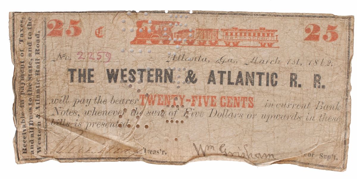 Bond coupon from “The Western & Atlantic R. R.,” 4.75 x 2.25, Atlanta, Georgia, March 1, 1862. Bond coupon redeemable for twenty-five cents, featuring an attractive image of a train at the top. In good to very good condition, with heavy overall creasing. The railroad became famous in the Andrews Raid, often called the Great Locomotive Chase, on the morning of April 12, 1862, when James J. Andrews and his Union raiders commandeered one of the Western & Atlantic trains and rode toward Chattanooga, doing as much damage to the rail as they could along the way.
