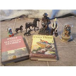 Bank Of California Gold Miner Coin Bank, With Crazy Horse Novel And Western Stories, And Two Todum Pole Salt And Pepper Shakers